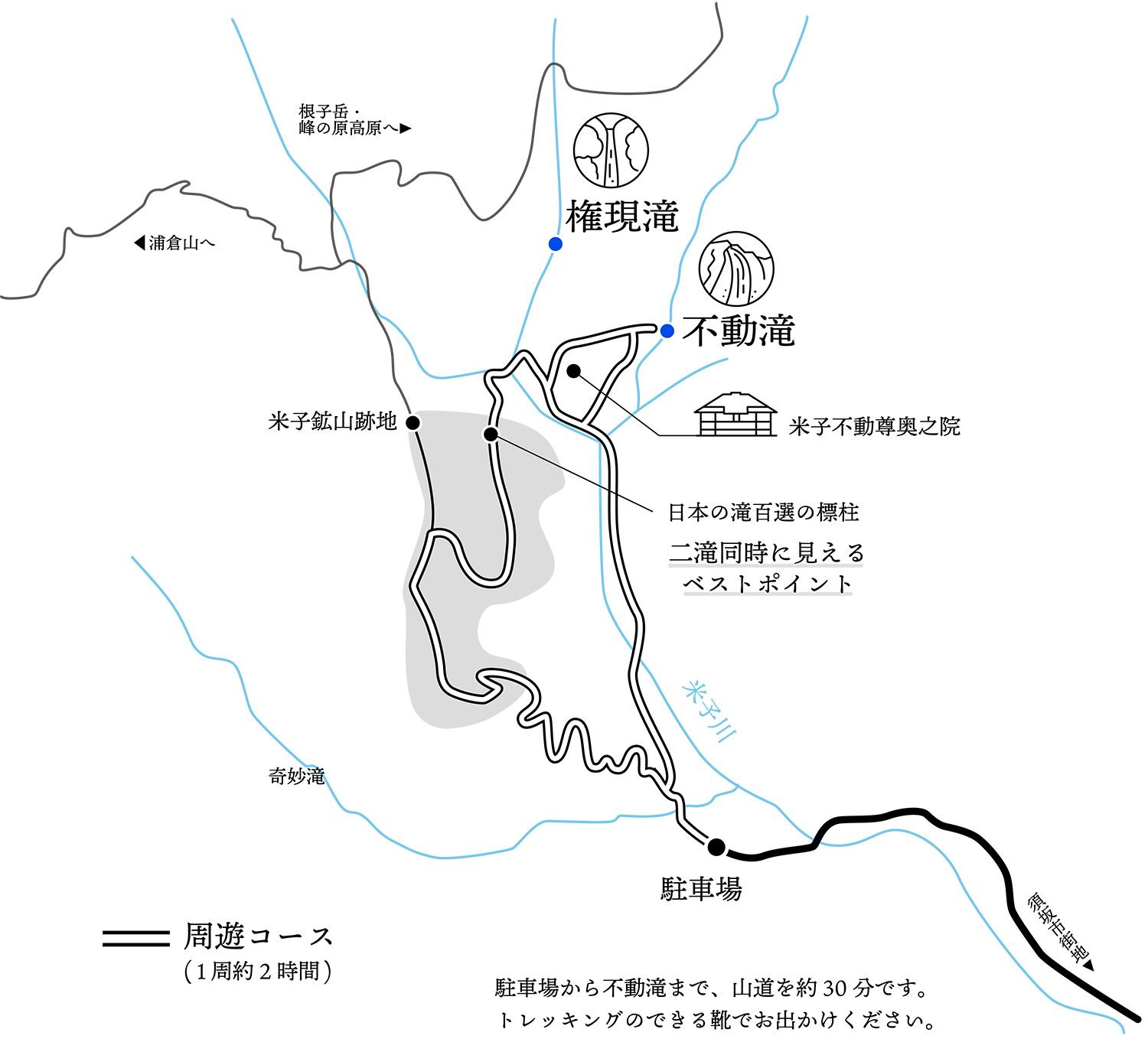 米子大瀑布は車&徒歩でのアクセスが可能です。須坂市内から40分で最寄りの駐車場に到着します。駐車場から2023年春に再開される登山道を30分程度歩くと不動滝に到着します。米子鉱山跡地を巡る周遊コースもあり約2時間程度で踏破することができます。ロングトレイルも可能で根子岳まで続くトレイルも整備しています。