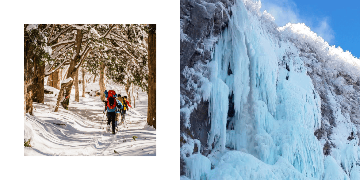 冬の米子大瀑布は幾条もの滝が凍り付き、不動滝・権現滝は100mを越える大氷瀑となります。白銀の鉱山台地から眺めるその姿は荘厳です。雪上車でアプローチし、ガイド付きスノーシューイングで一日を過ごしていただけます。雪山初めての方でもご参加いただけるように防寒ブーツ・スノーシューはレンタル可能です。