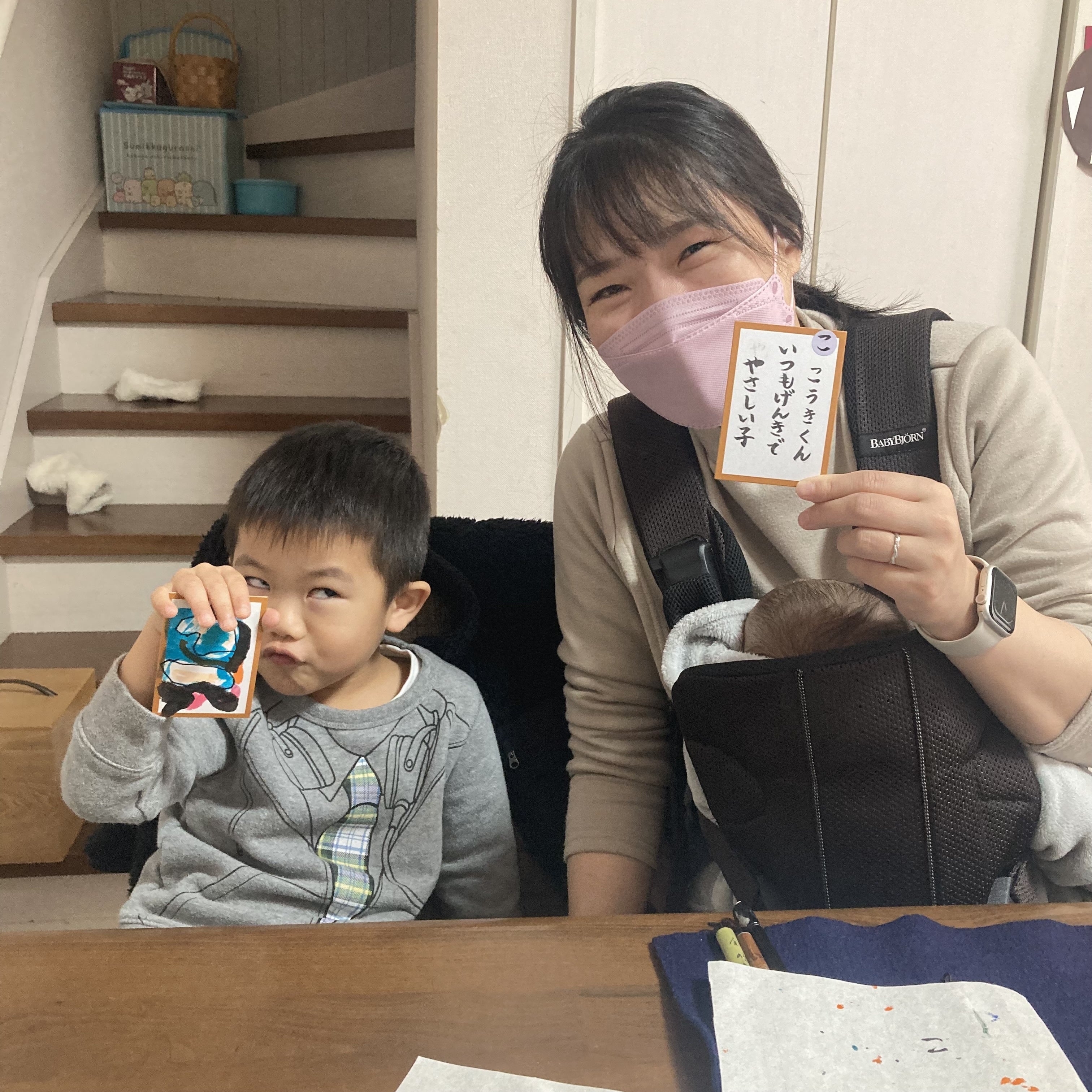長女が一生懸命、考えます。私が読み札を読んであげると──