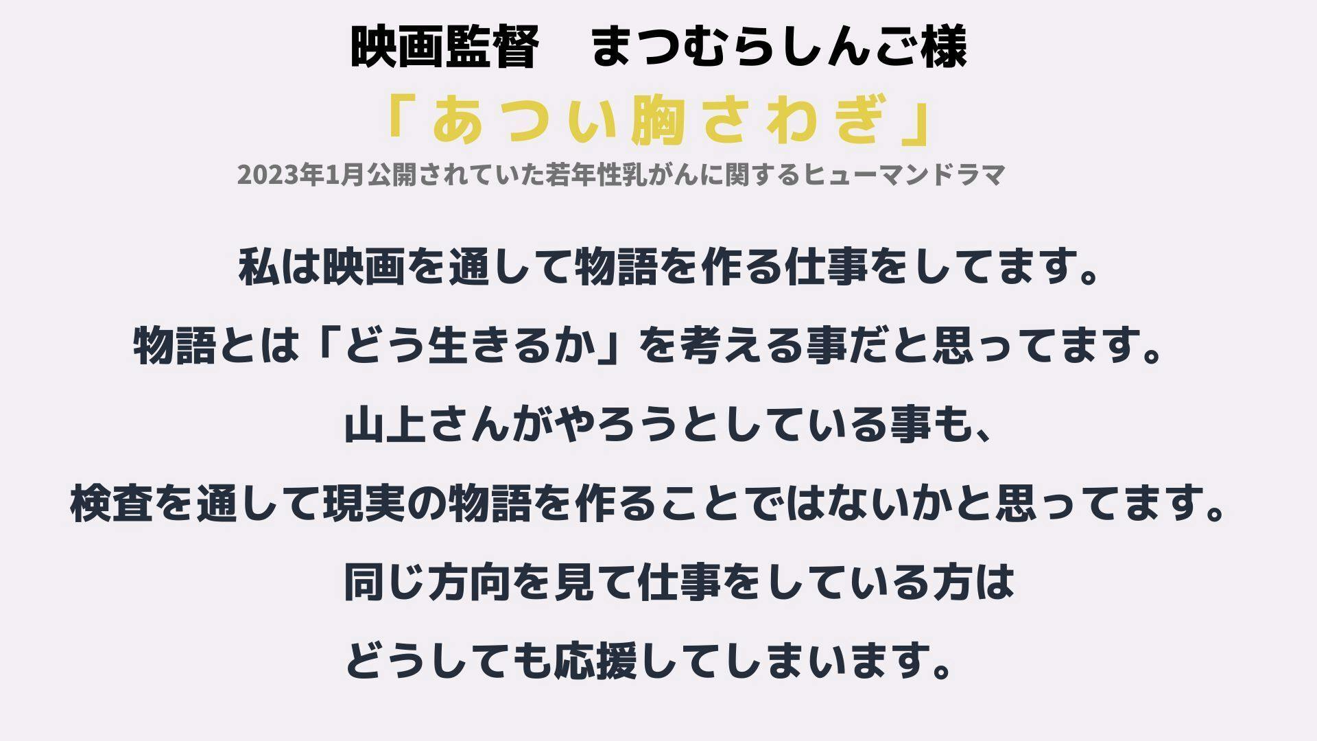 2023/12/21 15:57皆様、こんにちは。プロジェクトオーナーの山上です。痛くない最新の乳がん検査を、カフェなど普段の動線で受ける「NCT」を一人でも多くの方に知っていただくため、12/7(木)表参道で開催されたフェムテックジャパンに初出展しました。当日、6種類の乳がん検査を実体験した経験から、今後の乳がん検査の受け方についてセミナーも実施させていただき、多くの方から反響をいただきました。セミナーの様子聴講者コメント・わかりやすく、理解できた・知らなかった事も多くて為になった・多くの人に危機感をもっと持って欲しい・社会課題と自分事の両軸で考えられる・現状課題からの啓蒙活動、検査の実態も含めた未来予測でわかりやすく共感しました・ブースでの取り組み事例NCTの世界観を2つの香りで演出アロマ投票を実施しました。多くの投票協力ありがとうございました!!たくさんの方から、NCT構想に対する、多くの支持をいただきました。•痛くないがん検診ならぜひ受けたい。•病院へ行かなくていいならぜひ受診したい。•どこで?いくらで受けられる?•病院の待ち時間が苦痛で仕方がない.来年、社会実装を目指し、チームメンバー、アンバサダーの皆様のお力をお借りし、実現したいと思います。 引き続き、どうぞよろしくお願いいたします。 もっと見る