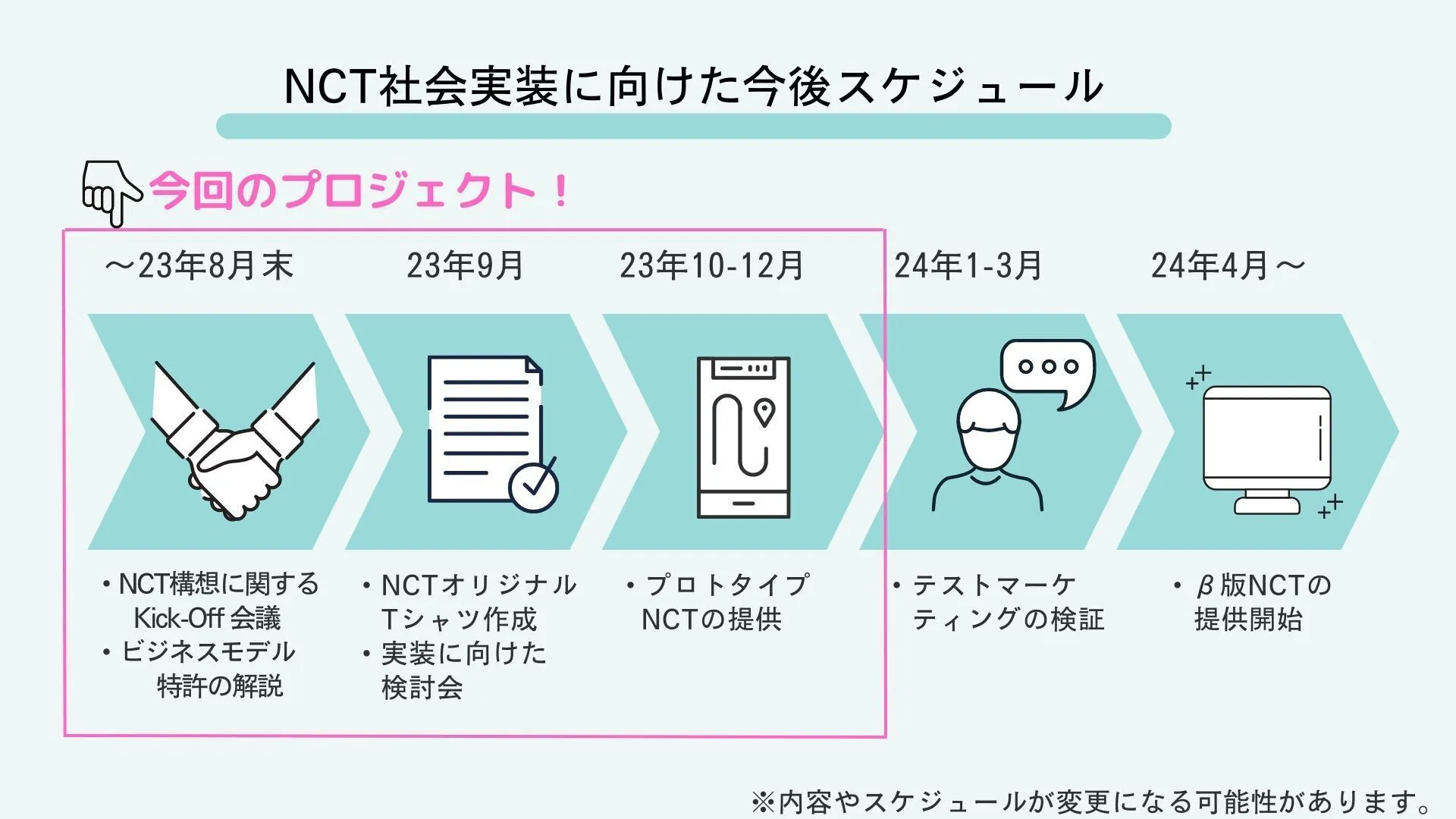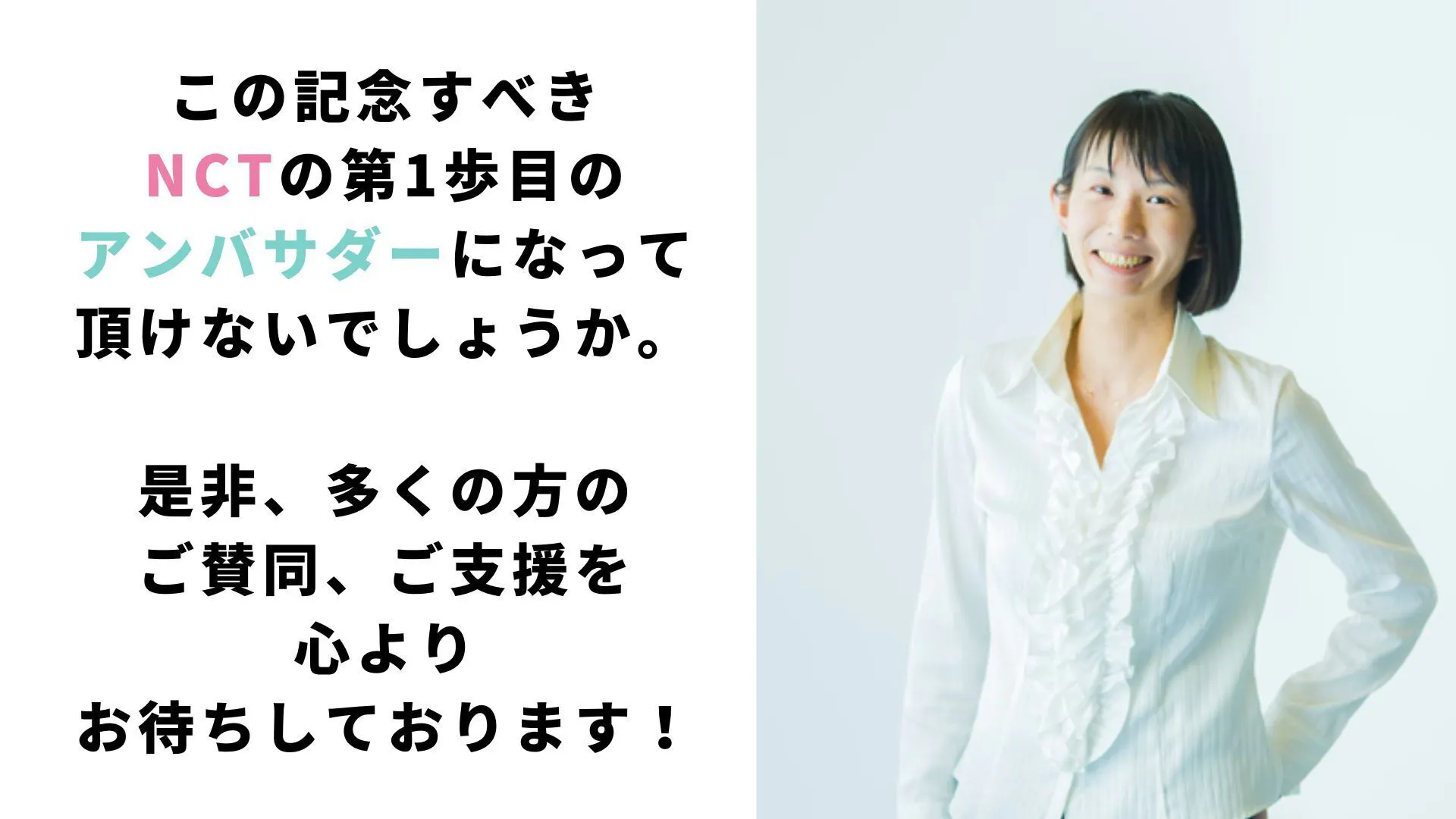- ・今年度中に、まだ、世にない”NCT”の社会実装を目指しています。第1期NCTアンバサダーになることで、その立役者になることができます
