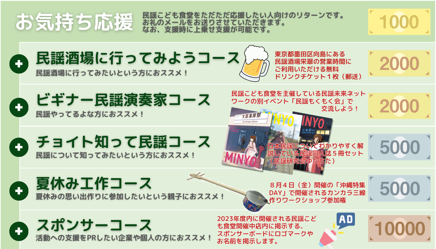ご支援くださる方々の様々なお立場やニーズをイメージし、主催や関係者で様々なリターンをご用意させていただきました。各コースで、上乗せ支援をいただいた場合は、民謡未来ネットワークHPでのお名前の掲載と、報告書をメールで送付させていただきます。応援メッセージも励みになります!