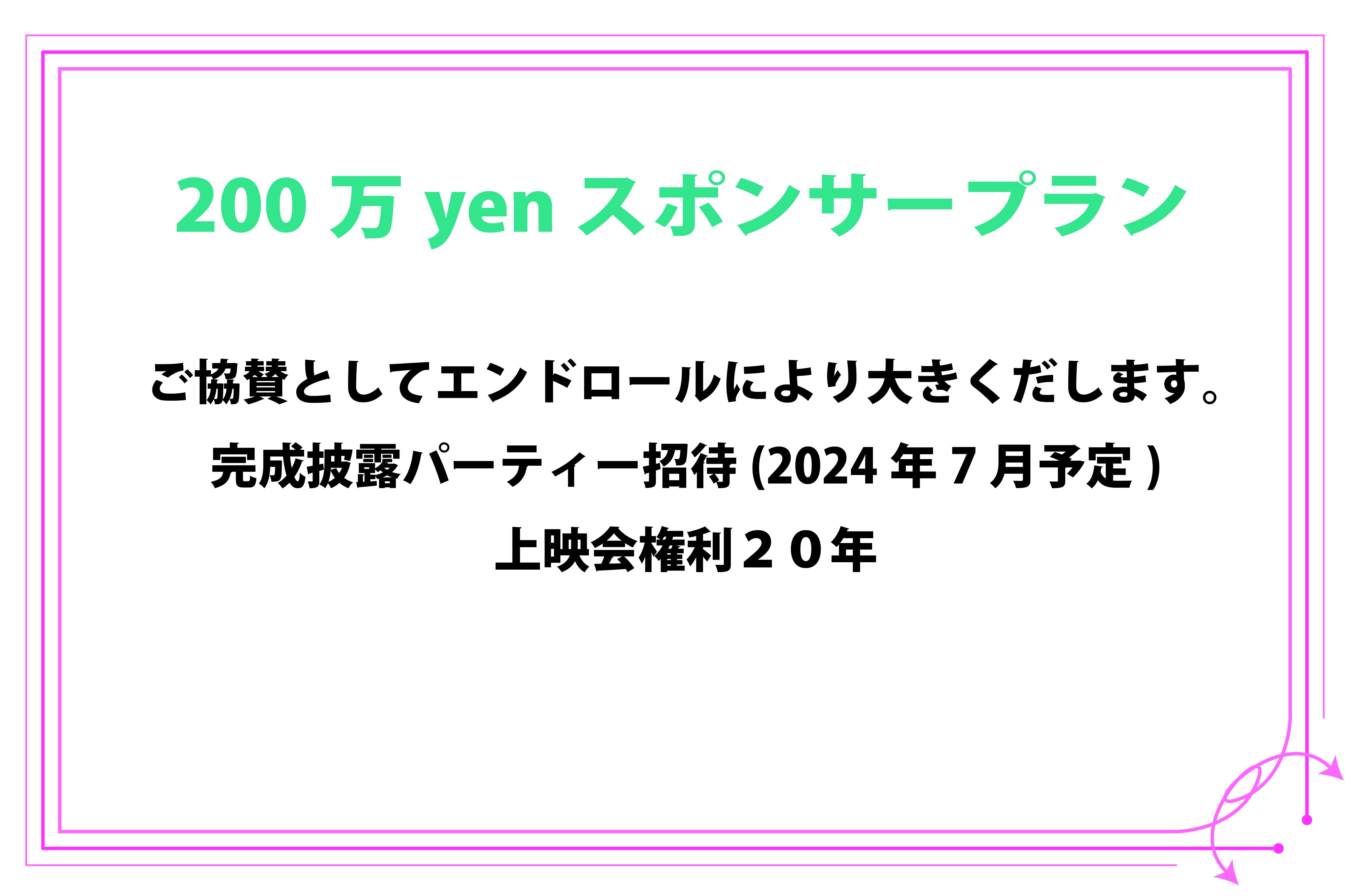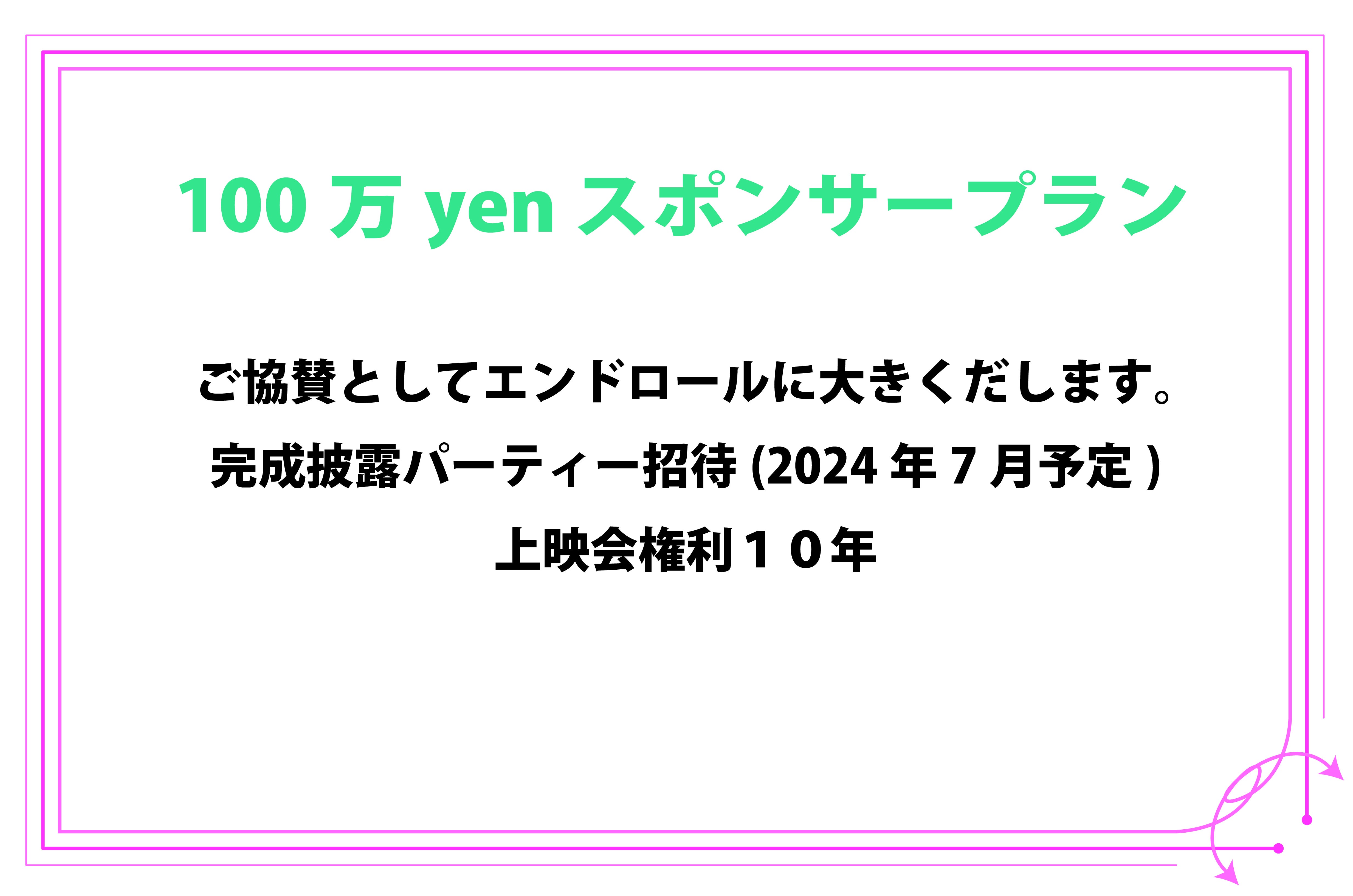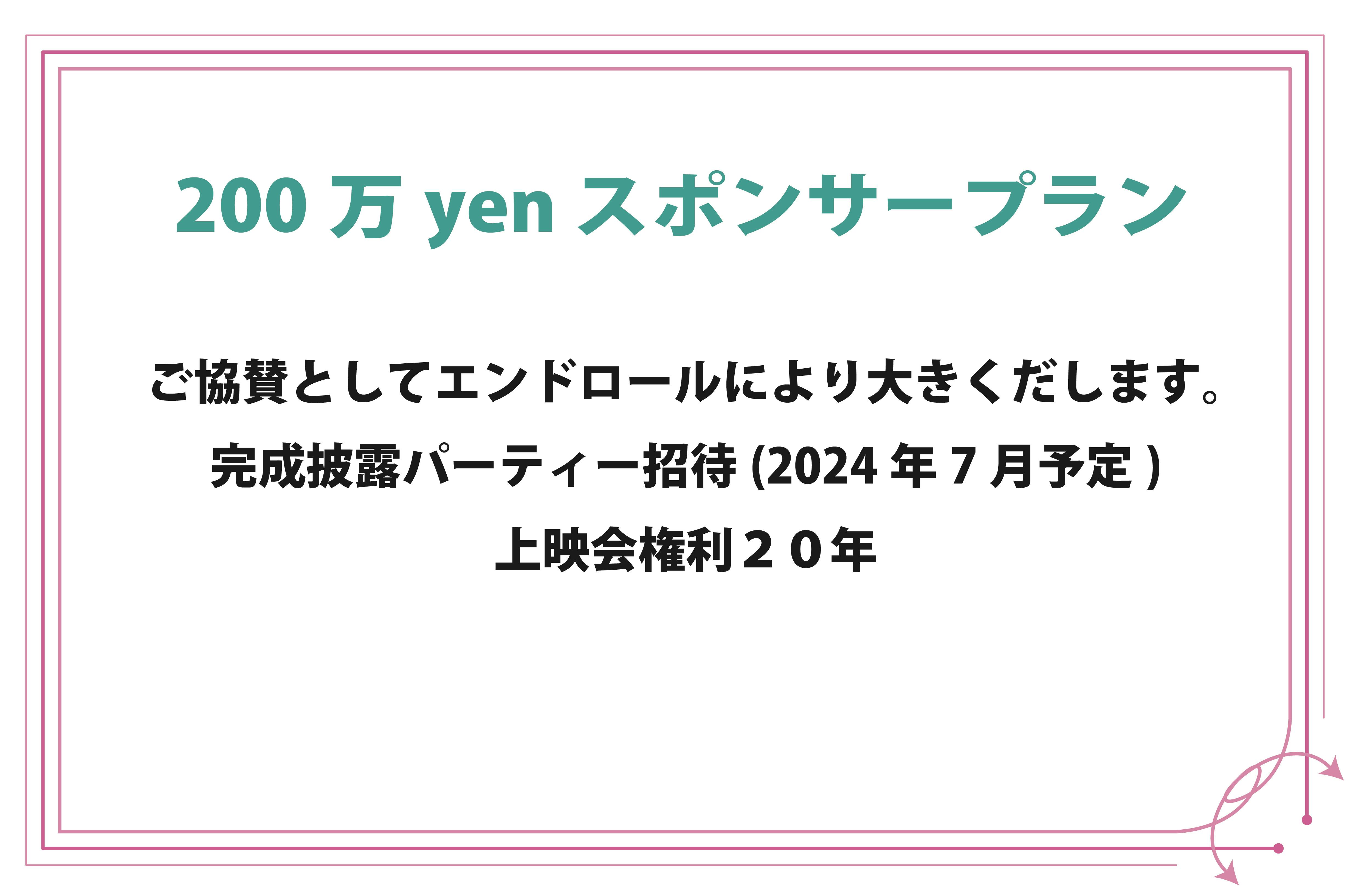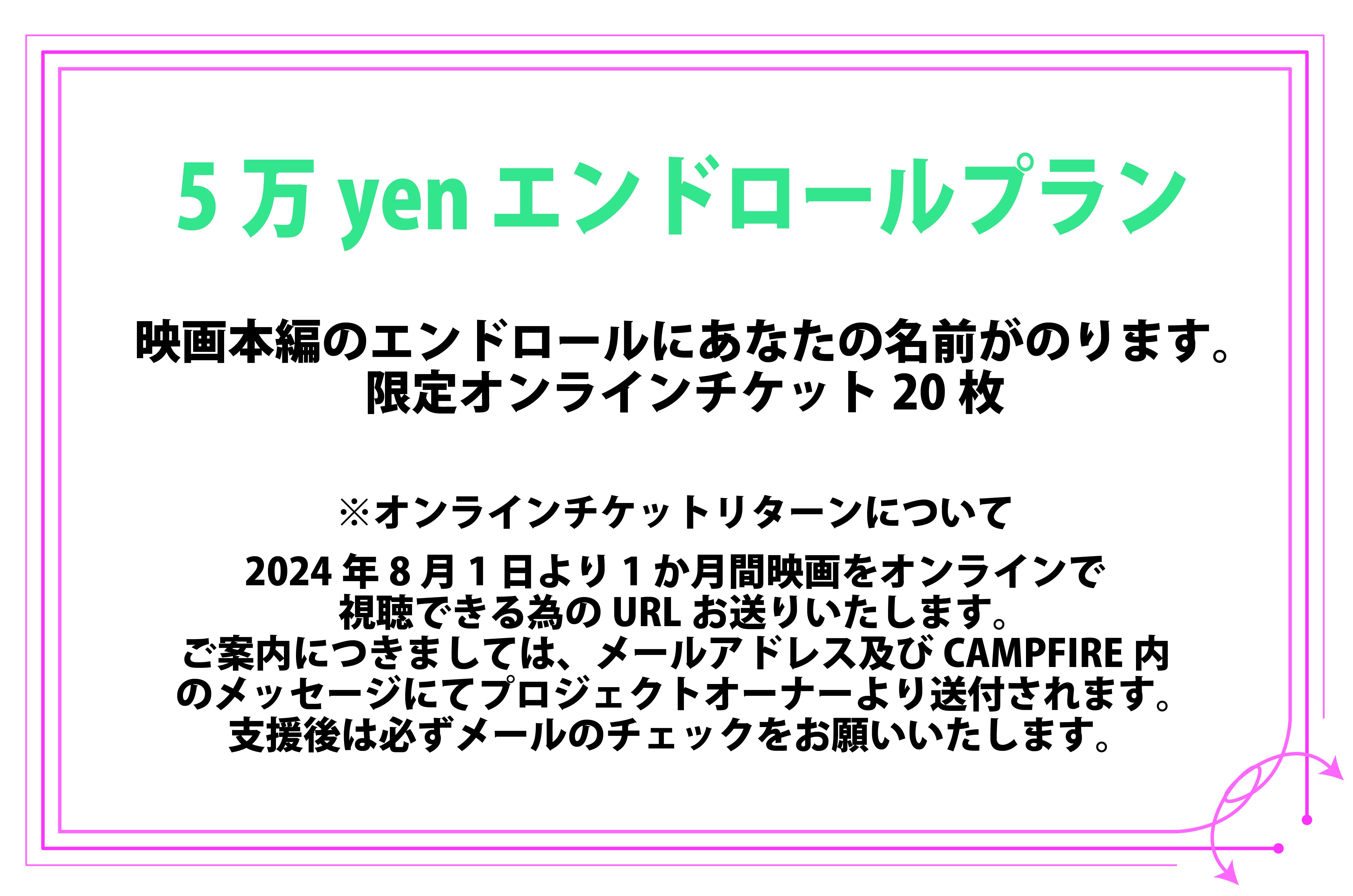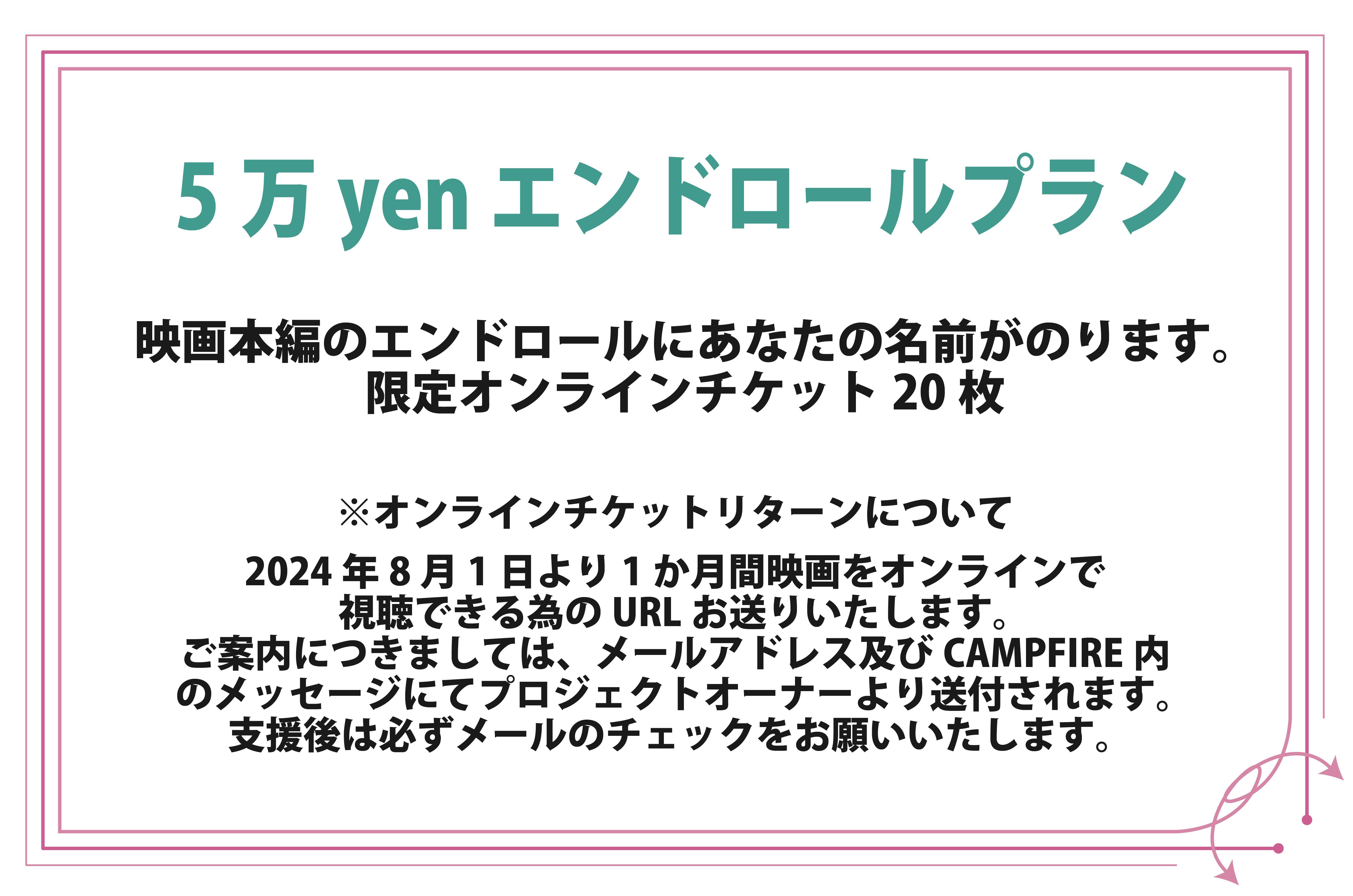 ・一部のリターンに「エンドロールへのお名前記載」がございます。支援時に備考欄(リターンに関するご希望)に掲載希望のお名前をご記入下さい。(10文字以内本名可)掲載を希望しない場合は『記載なし』と記入ください。特にご希望がない場合はCAMPFIREにて使用されているハンドルネームを使用させて頂きます、また特定の人物を比喩する内容や公序良俗に反する内容に関しては掲載をお断りする可能性ございますのでご注意ください。