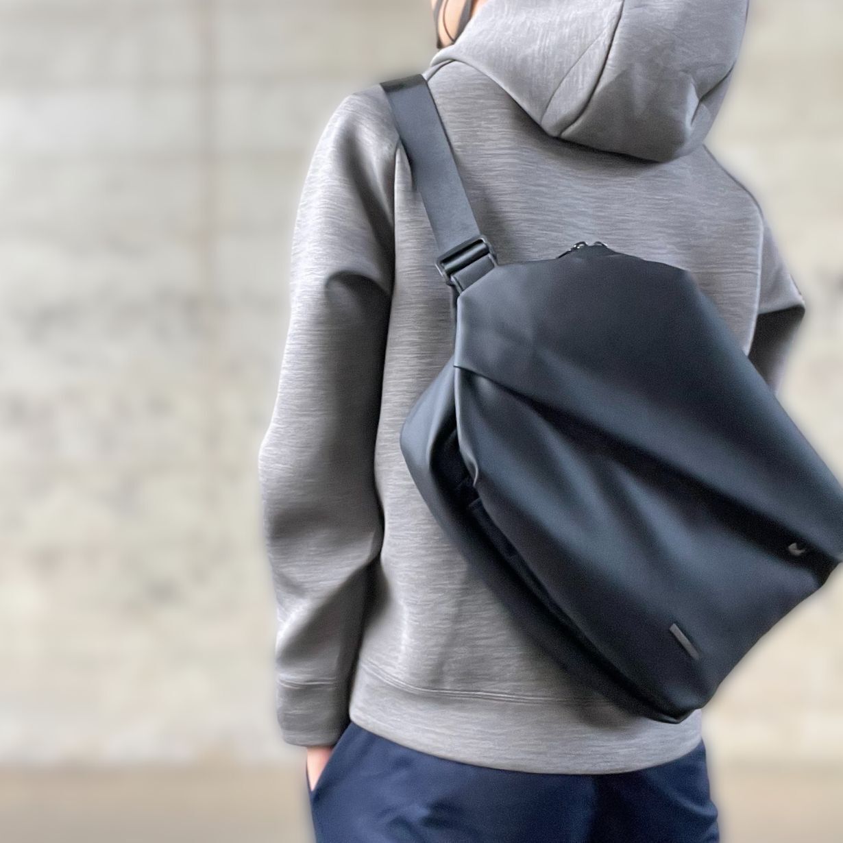13インチパソコンがすっぽり入るサイズのミニマルなボディバッグは、必要最低限のものだけを持ち出し、お気に入りの場所まで自由に移動できます。
