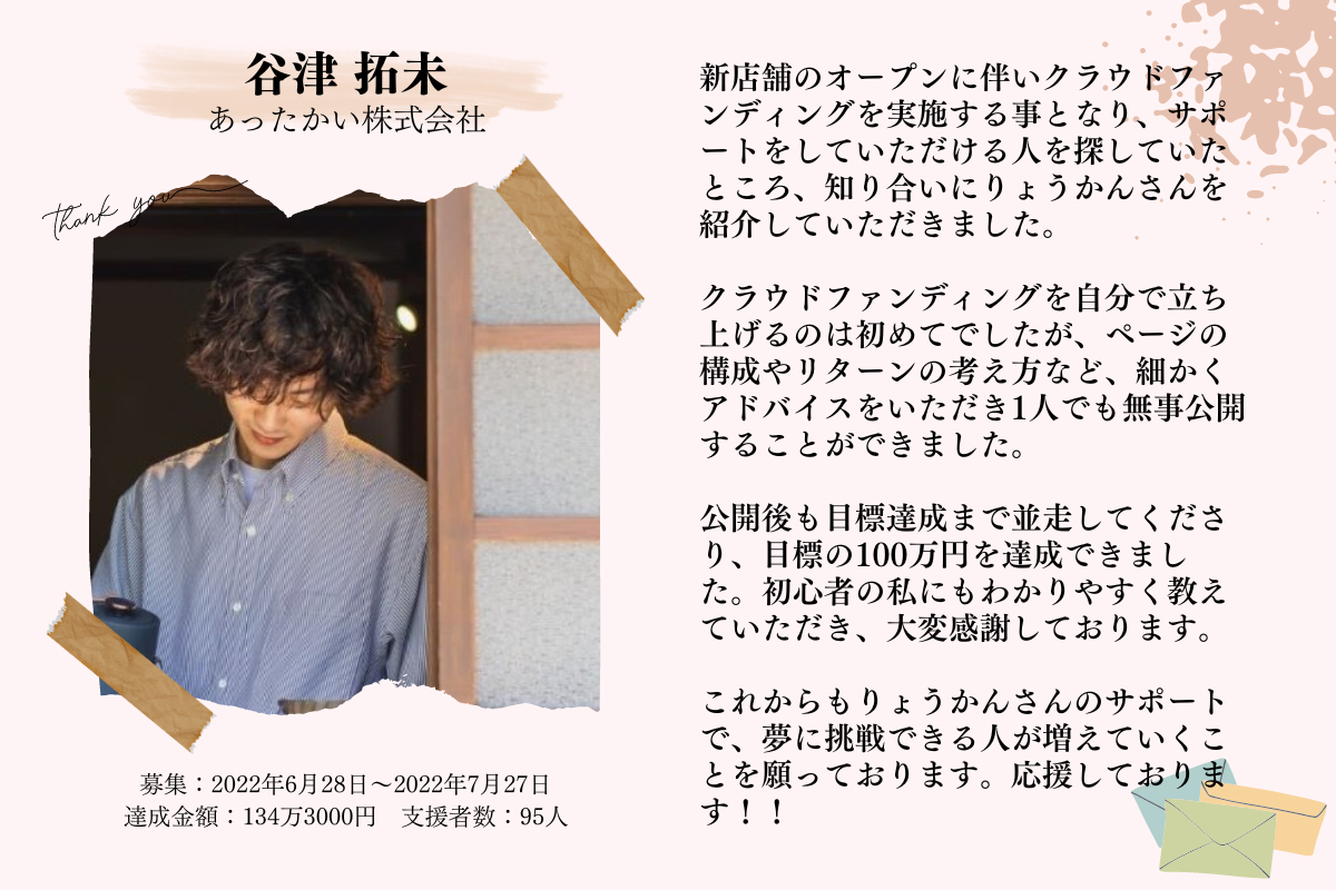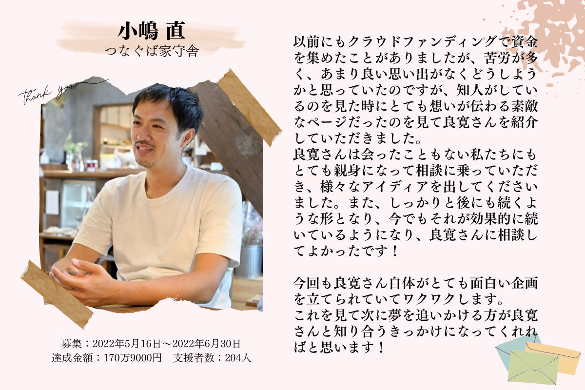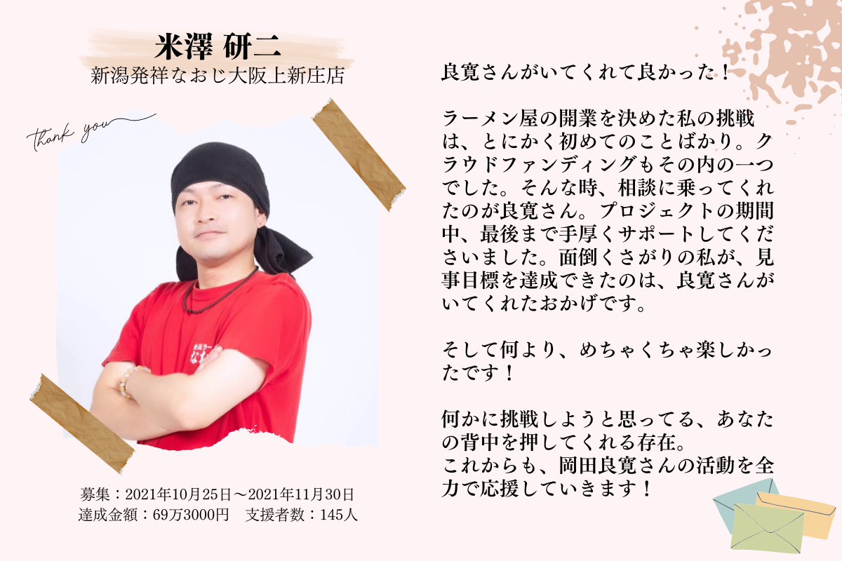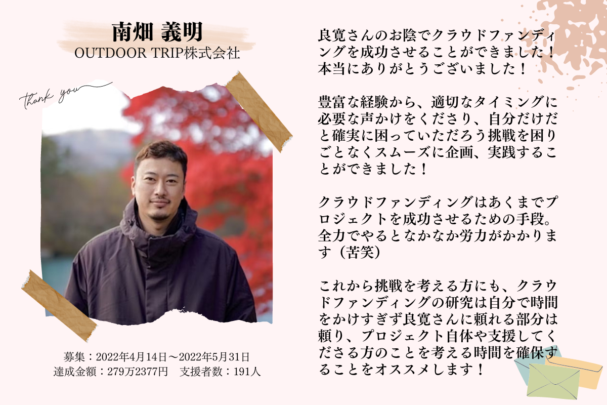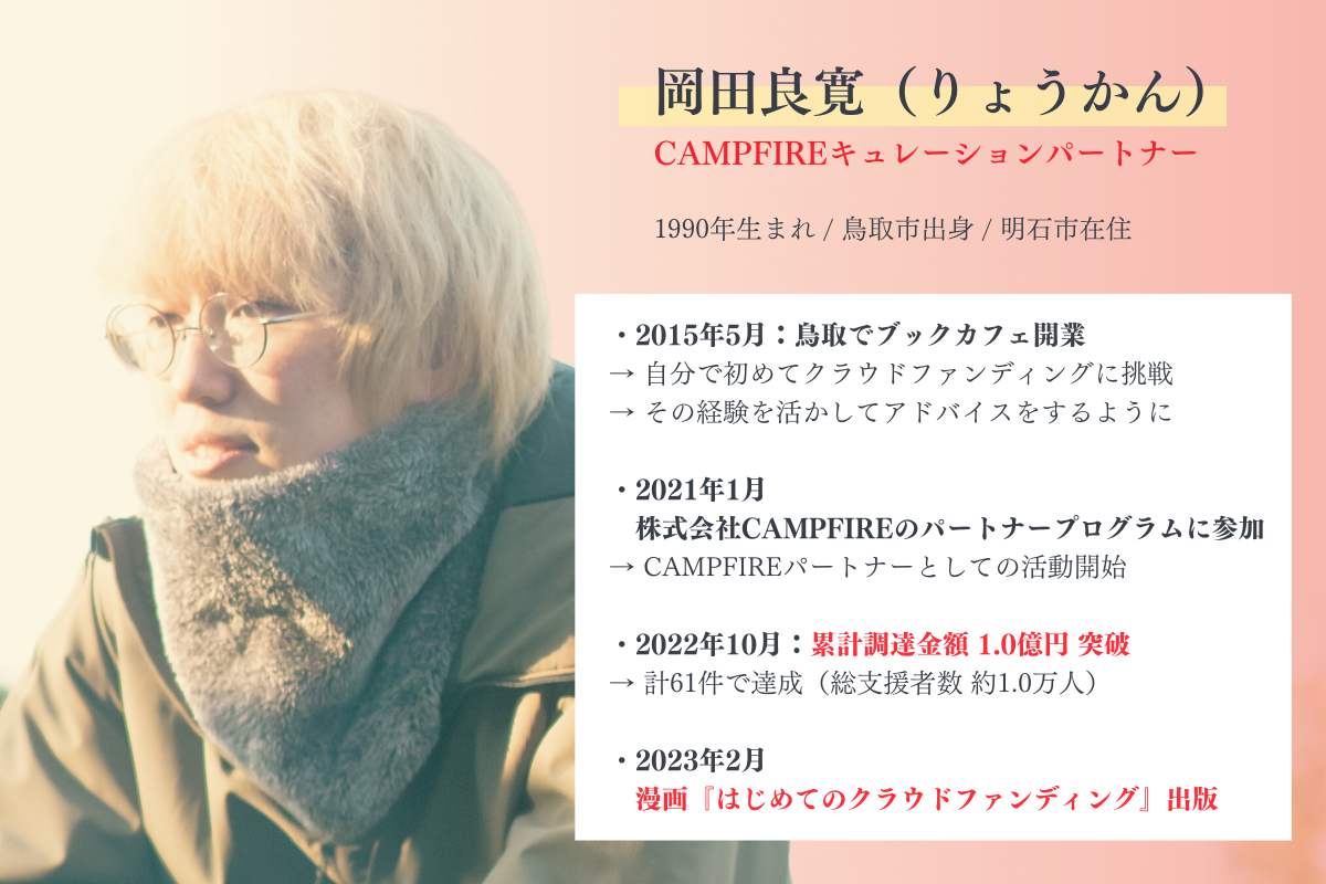 はじめまして!CAMPFIREパートナーの 岡田良寛(りょうかん) です。