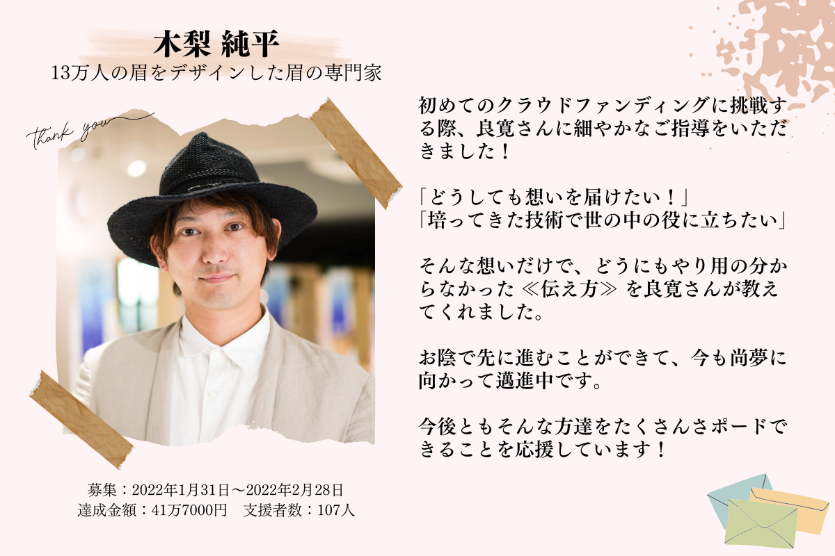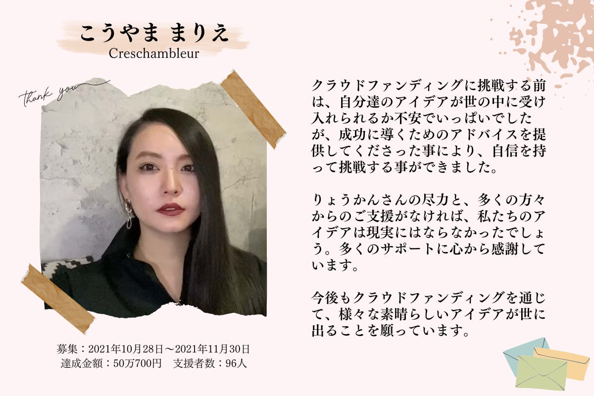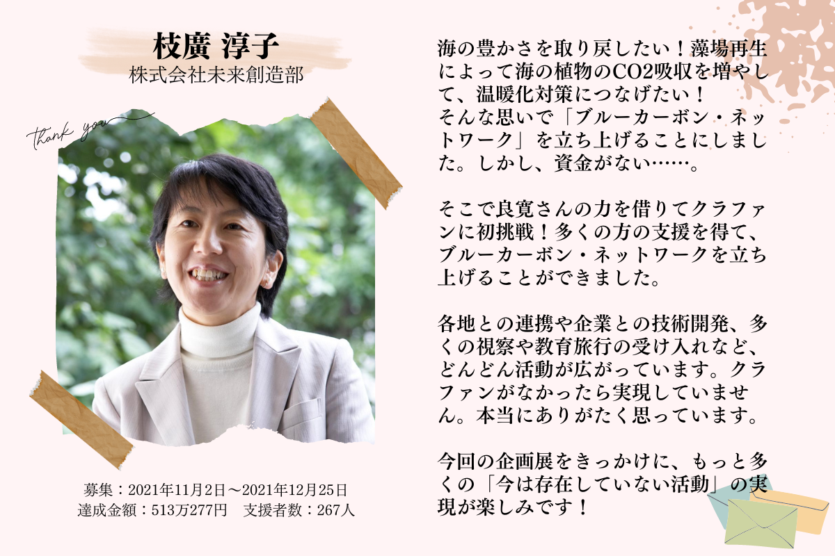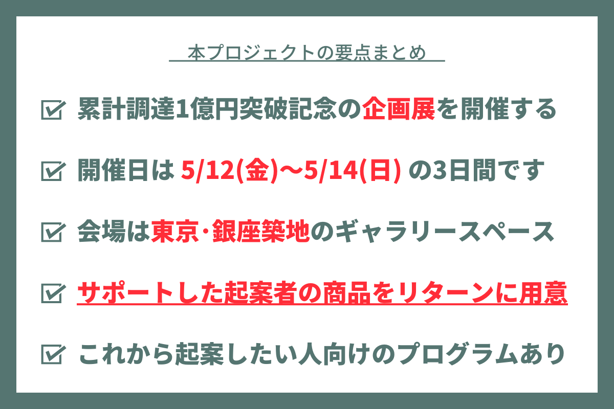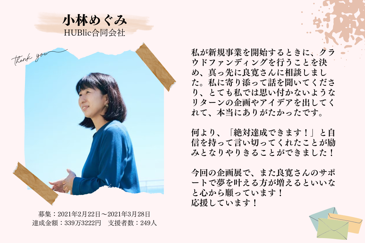 そして、この感謝展開催のためにクラウドファンディングを実施することで、素敵な想いや夢を叶えてきた魅力的な起案者の方々に改めてスポットライトを当て、少しでも彼ら彼女らのプロジェクト・事業にプラスな要素を与えたいと思い、コラボリターンや応援コメントなどの協力をお願いしました。
