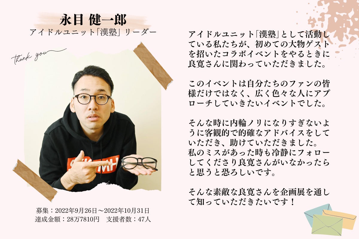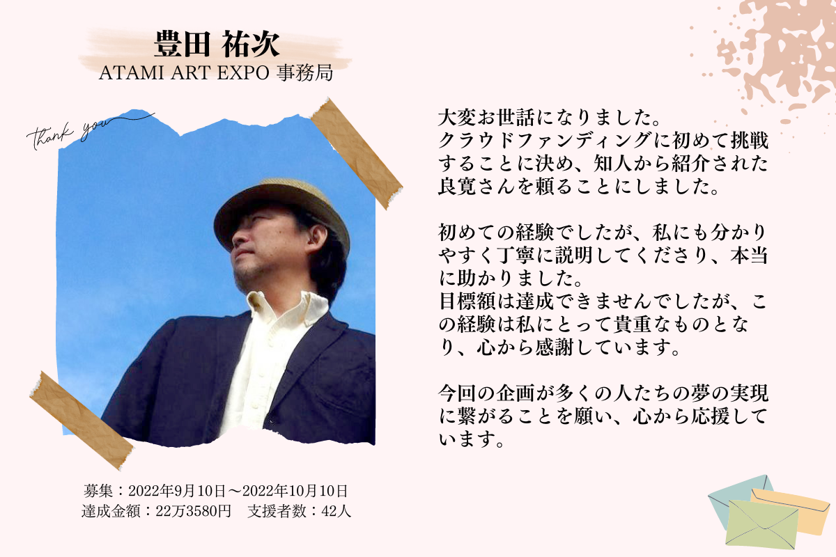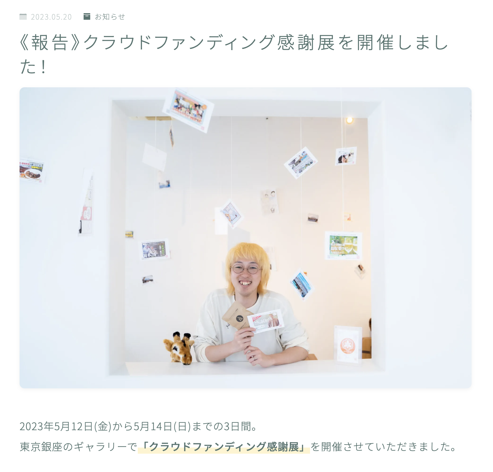 2023/05/20 17:11どうも、CAMPFIREパートナーの岡田良寛(りょうかん)です。クラウドファンディング感謝展の開催から早1週間が経ちました。御祝儀リターンで宣言していた「企画展の開催終了後に作成する実施報告レポート記事」を公開させてもらいました。» 実施報告レポート記事を読む|makikube.comこの報告レポート内では・感謝点当日の会場の雰囲気(写真)・会場に掲示していた感謝コメント・来場者の感想投稿の紹介・御祝儀リターンの支援者の紹介などを書かせてもらっています。ぜひ読んでいただけると嬉しいです!» 《報告》クラウドファンディング感謝展を開催しました! もっと見る