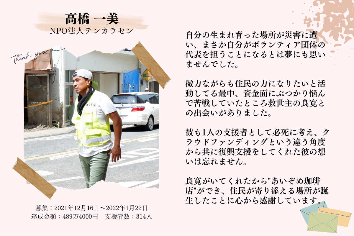 プロジェクトの特徴としては、ゲストハウスや飲食店などの「店舗立ち上げ系」や、台風被害などの「災害復興系」に、新しい商品を販売する「先行販売プロモーション系」に関するものを多く担当しています。