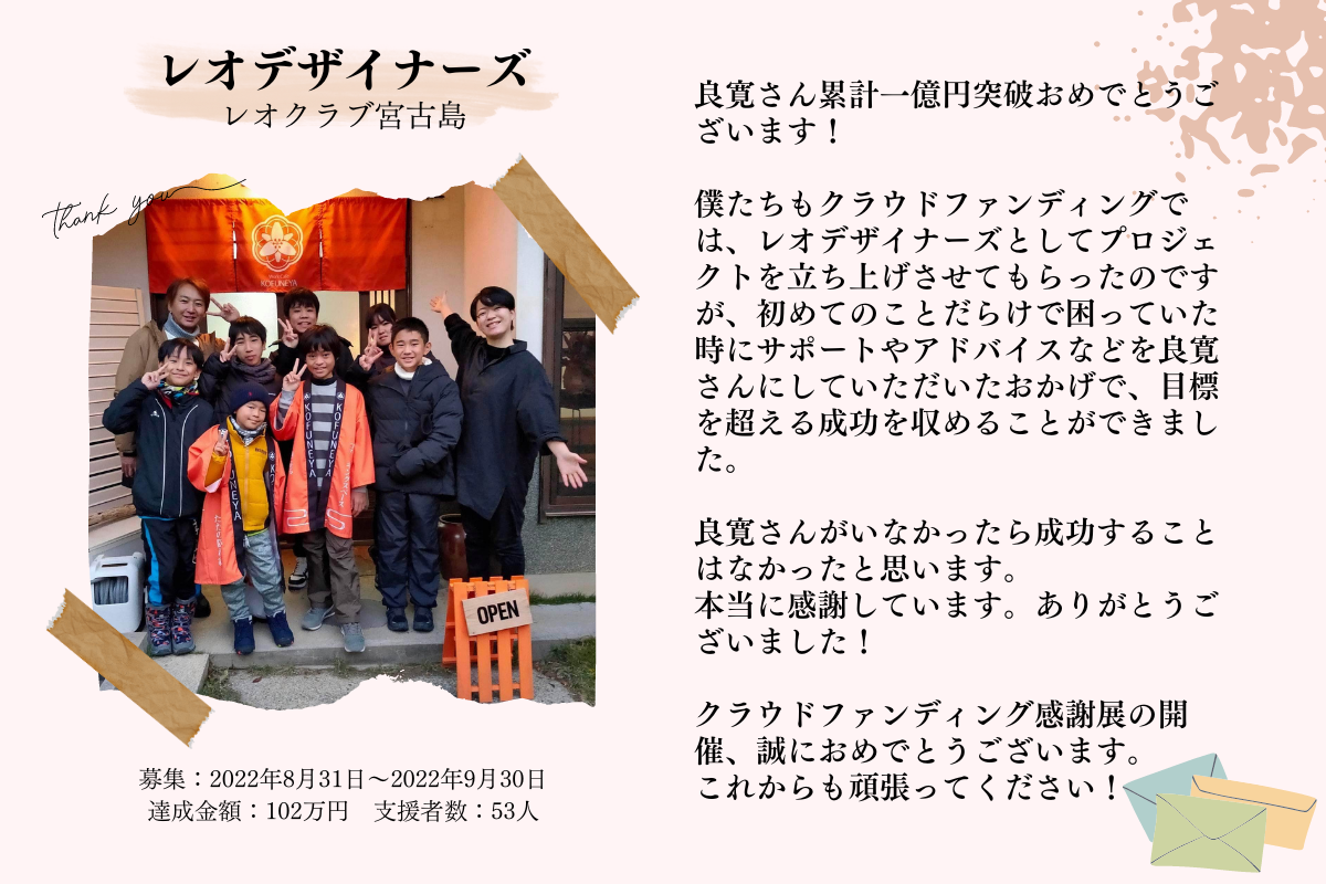 たくさんの素敵な起案者の皆さんとの出会いのおかげで、担当したプロジェクトの調達貢献金額が【累計1億円】を突破できました。本当に感謝しかありません。