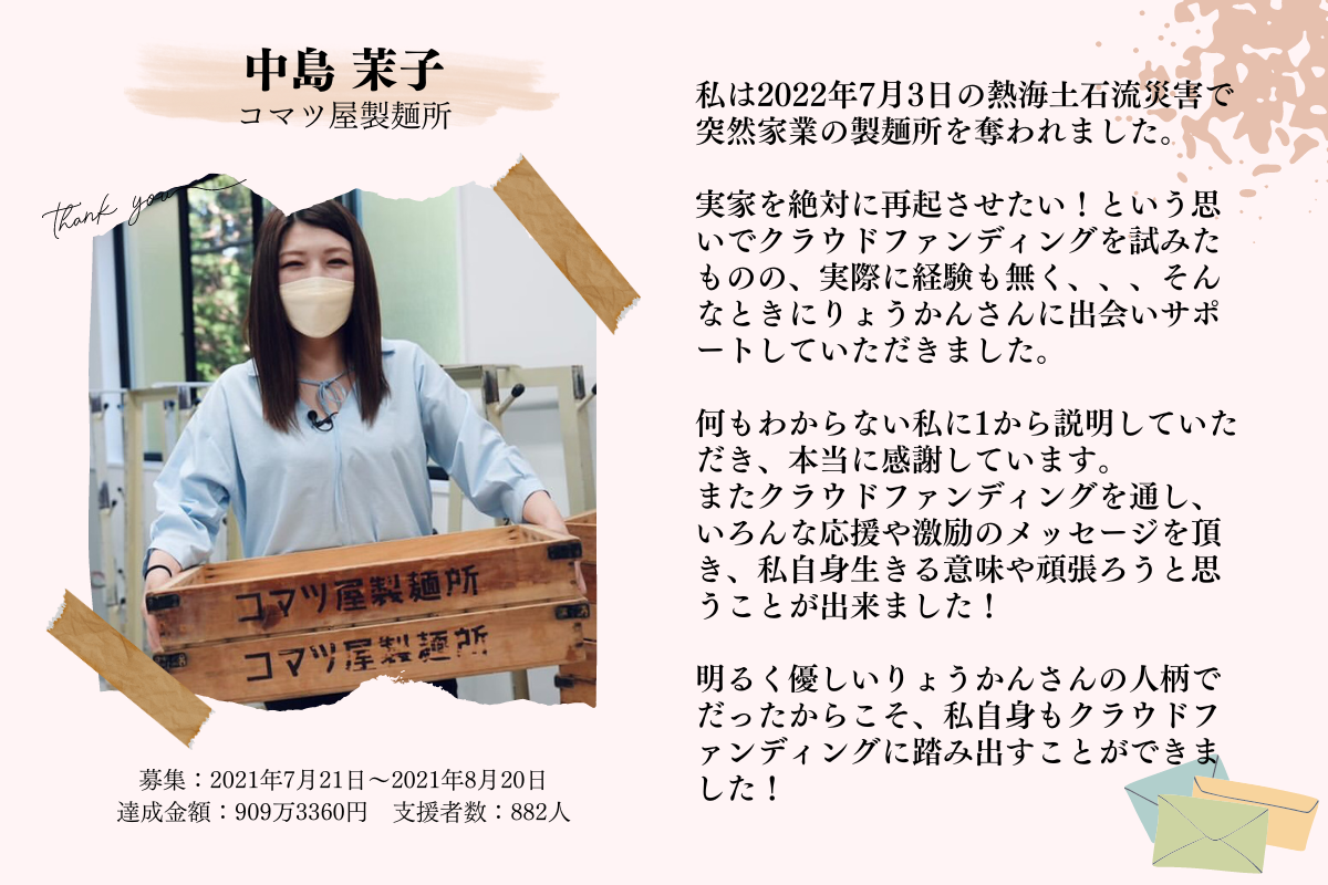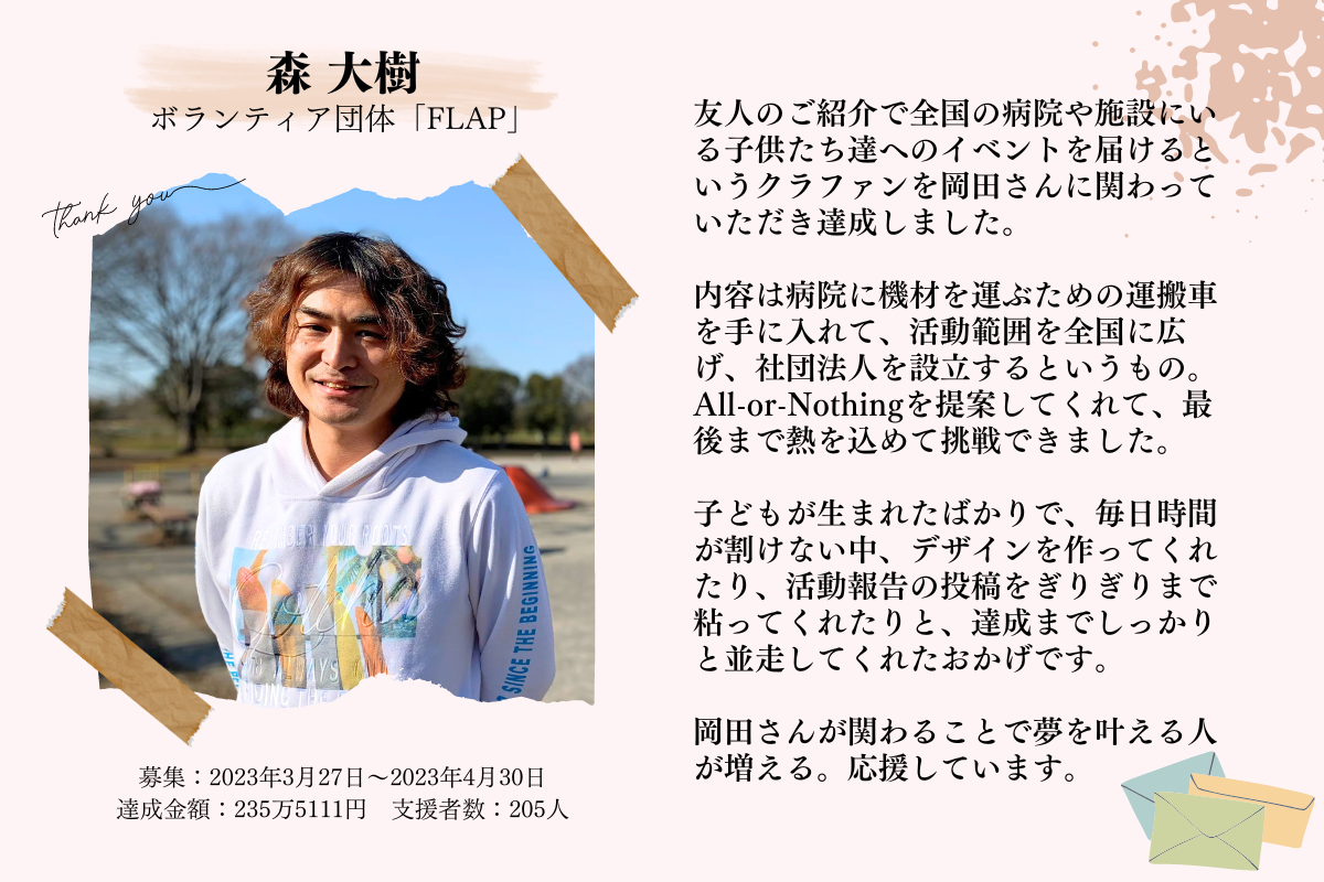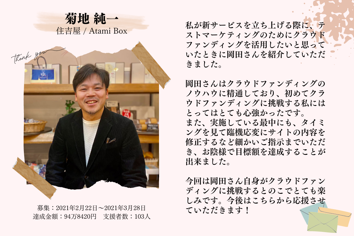 2023/12/30 20:30今年も残すところ1日。大晦日を前に感謝のご挨拶を送らせていただきます。2023年もたくさんご縁に恵まれることができました。本当にありがとうございます!この1年のクラウドファンディングサポートの実績をお伝えすると・公開件数:36件・達成総額:49,877,272円という結果になっており今年も非常に多くのプロジェクトに携わらせていただくことができました。本当に感謝しかありません。しかし、実を言うと昨年比でそれぞれの数値が落ち込んだのも事実です。特に、公開件数が減少してしまったことは強い悔しさを感じています▼ 詳しい数値はこちらの記事で紹介していますhttps://makikube.com/annual-report-2023/辰年となる来年2024年は「龍」のように高みを目指して、公開件数の目標として【 最低50件 】を掲げることにしました!皆さんの夢(想い)をCAMPFIREで燃え上げられるよう、パートナーとして薪をくべるお手伝いをさせてください!と言うことで!!もし現在クラファン検討中の方がいればぜひ連絡いただけないでしょうか??周りでクラファンやろうとしている方を紹介していただけるのも大歓迎です!!2024年に僕自身ももっと飛躍していけるように力を貸していただけると嬉しいです!相談は事前ヒアリングシートから回答いただけるとプロジェクトの内容把握から日程調整までスムーズです!▼ 事前ヒアリングシートはこちらhttps://forms.gle/piM7AWrUCD8es9PRAぜひ気軽に相談ください!そして、2024年もどうぞよろしくお願いしますー!!=====P.S.今年の「CAMPFIREクラウドファンディングアワード2023」に僕の担当したプロジェクトが3件もノミネートされています!!» 詳細はこちら今年のアワードの大賞は、「支援総額」「支援者数」「話題性」に加えて「X(旧Twitter)にツイートされた投票数」によって決まるとのこと!ということで、どうか皆さんの力を合わせて僕の担当プロジェクトを大賞を受賞させていただけませんでしょうか?1日1回の投票すると豪華票品が当たるチャンスもあるそうです!ぜひ以下のリンクからツイート投票をしてもらえると嬉しいです…!!=====投票で応援しよう【 2024年1月4日まで 】» 熱海を舞台にした映画『温泉シャーク』の制作プロジェクトに投票する» 鳥取の「小さき花園幼稚園」の認可70周年記念プロジェクトに投票する» 発明で驚きを与えたトレイルフード「UL弁当」のプロジェクトに投票する=====この中でも、特に「温泉シャーク」と「UL弁当」のプロジェクトはカテゴリ大賞の受賞可能性が高いので、ぜひ投票締切の新年1月4日までの1日1回の投票への協力を何卒よろしくお願いします!!!CAMPFIREパートナー岡田良寛( りょうかん ) もっと見る