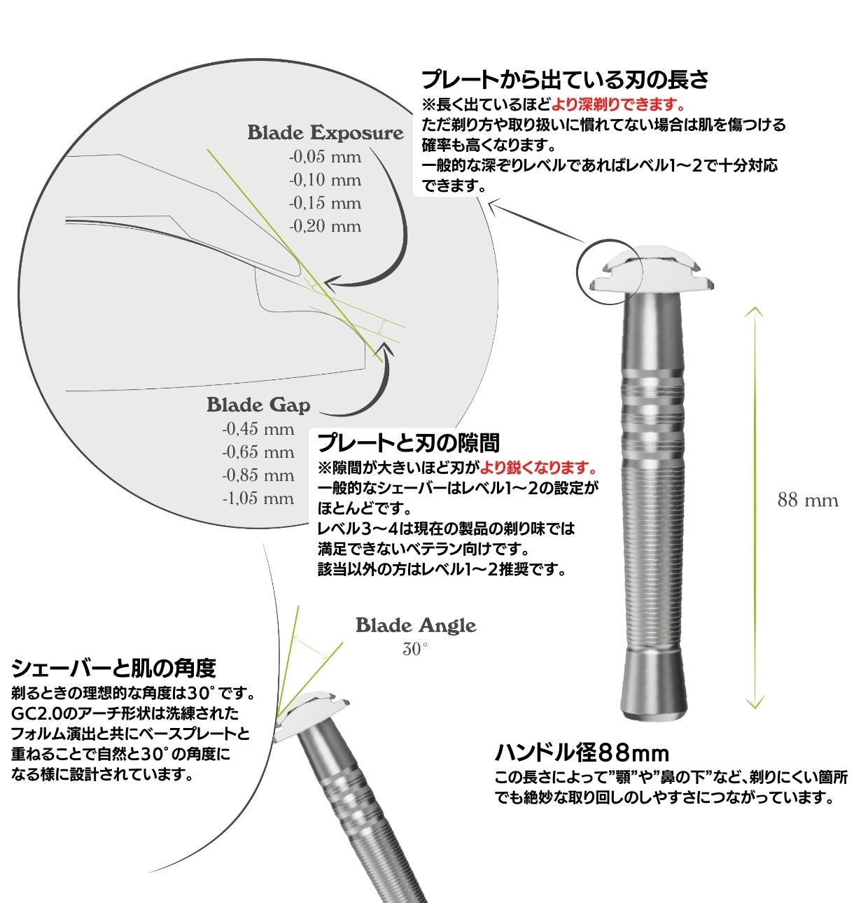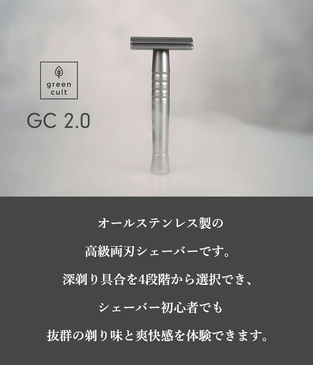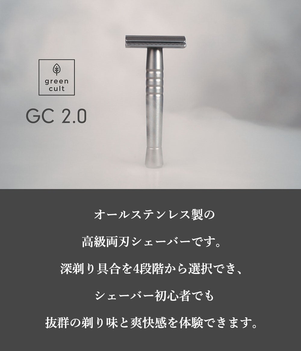 GC2.0はgreen cultの最新型高級カミソリシェーバーです。初めて髭剃りを使用する方(レベル1/プレートⅠ)から、深剃りを極めたい超ベテランの方(レベル4/プレートⅣ)まで段階的に対応できる様に設計された、画期的な高精度シェーバーです。
