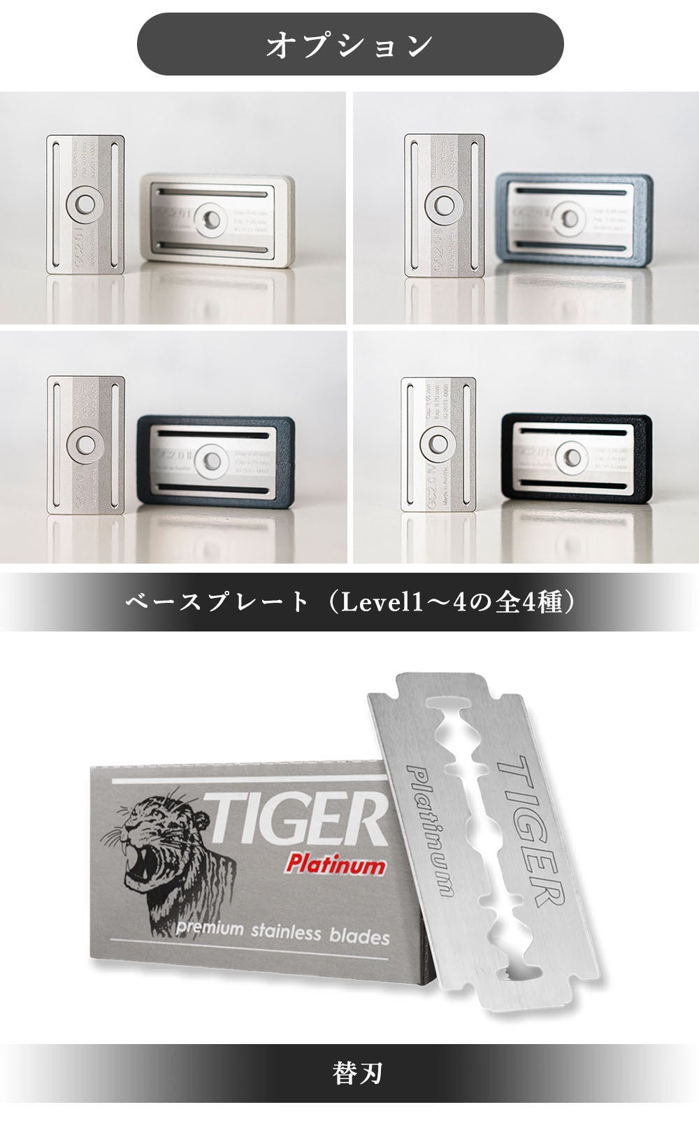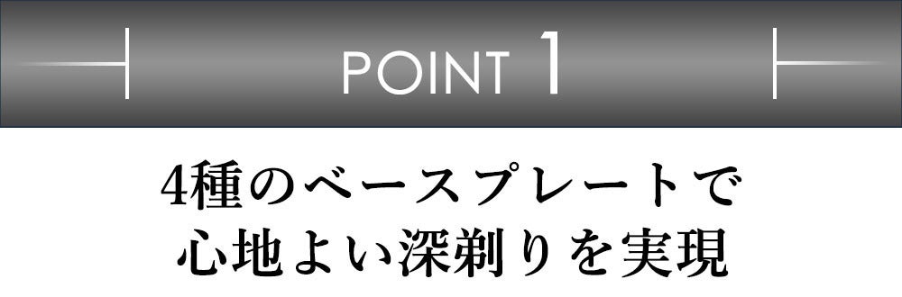 ※付属するベースプレートは1種類だけです。購入の際にお選びください。またお使いのベースプレートに慣れ、より確かな深剃りを味わいたい方はベースプレートのみ追加購入し対応できます。