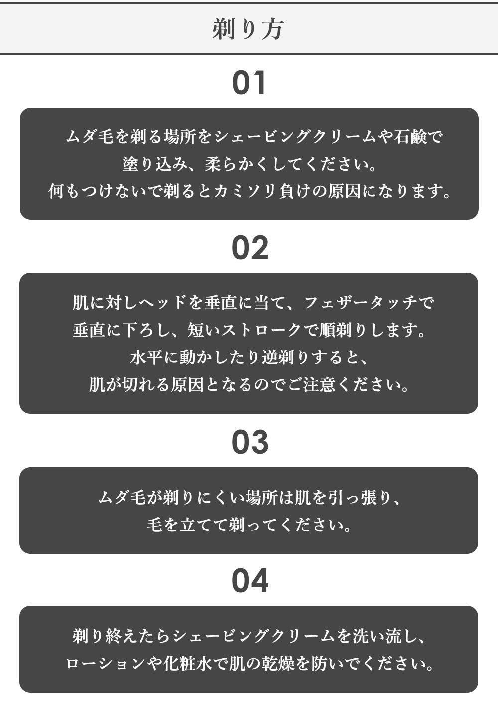 深剃りが魅力のカミソリ式シェーバーは剃り方に慣れてない方や製品によって肌への負担が大きいことが難点。
