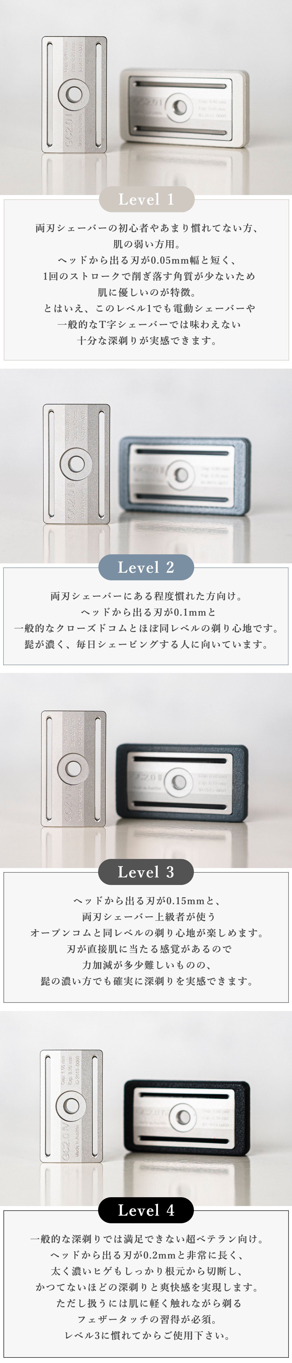 【GC2.0シェーバー】は刃先の出方が短く初心者でも扱いやすいクローズドコムのレベル1から、鋭く刃を出し、しっかりした深剃りでツルツル肌を実現するオープンコムのレベル4まで、刃の長さを調整できる4種類のベースプレートをご用意。