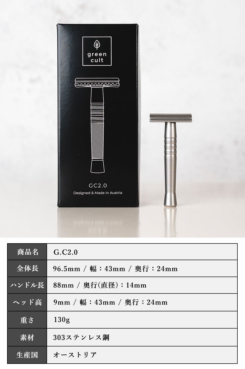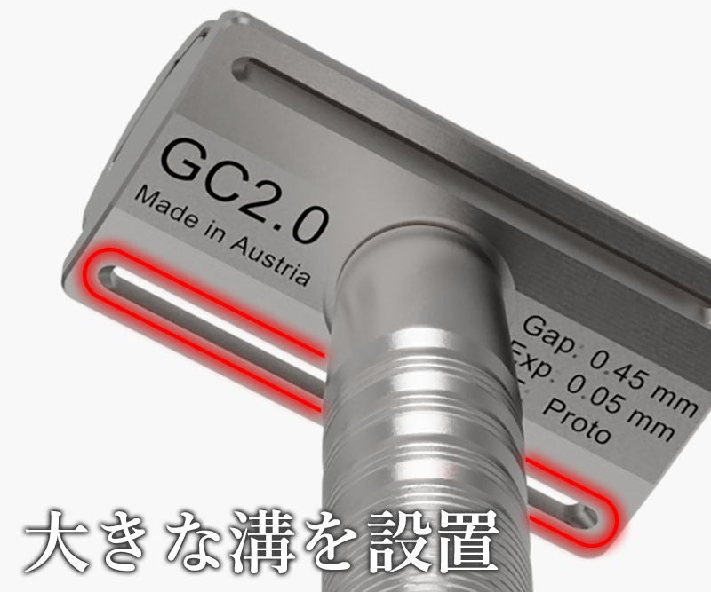 【GC2.0シェーバー】はカミソリ式髭剃り初心者でも手軽に使え、肌に優しく確かな深剃りを実感できる100%オーストリア製造の高品質両刃シェーバーです。