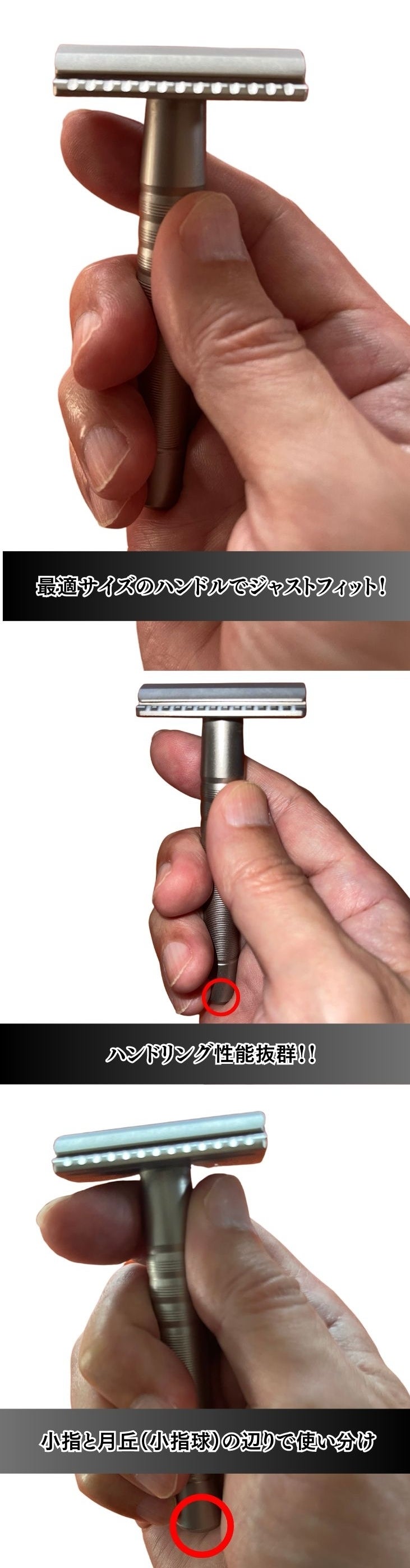 この画像のように、小指のあたりと月丘(小指球)のあたりで支える持ち方など、手にすっぽり収まるので自分で使いやすいよう自由に持ち変えて剃ることができ、絶妙なハンドリング捌きを可能にしています!