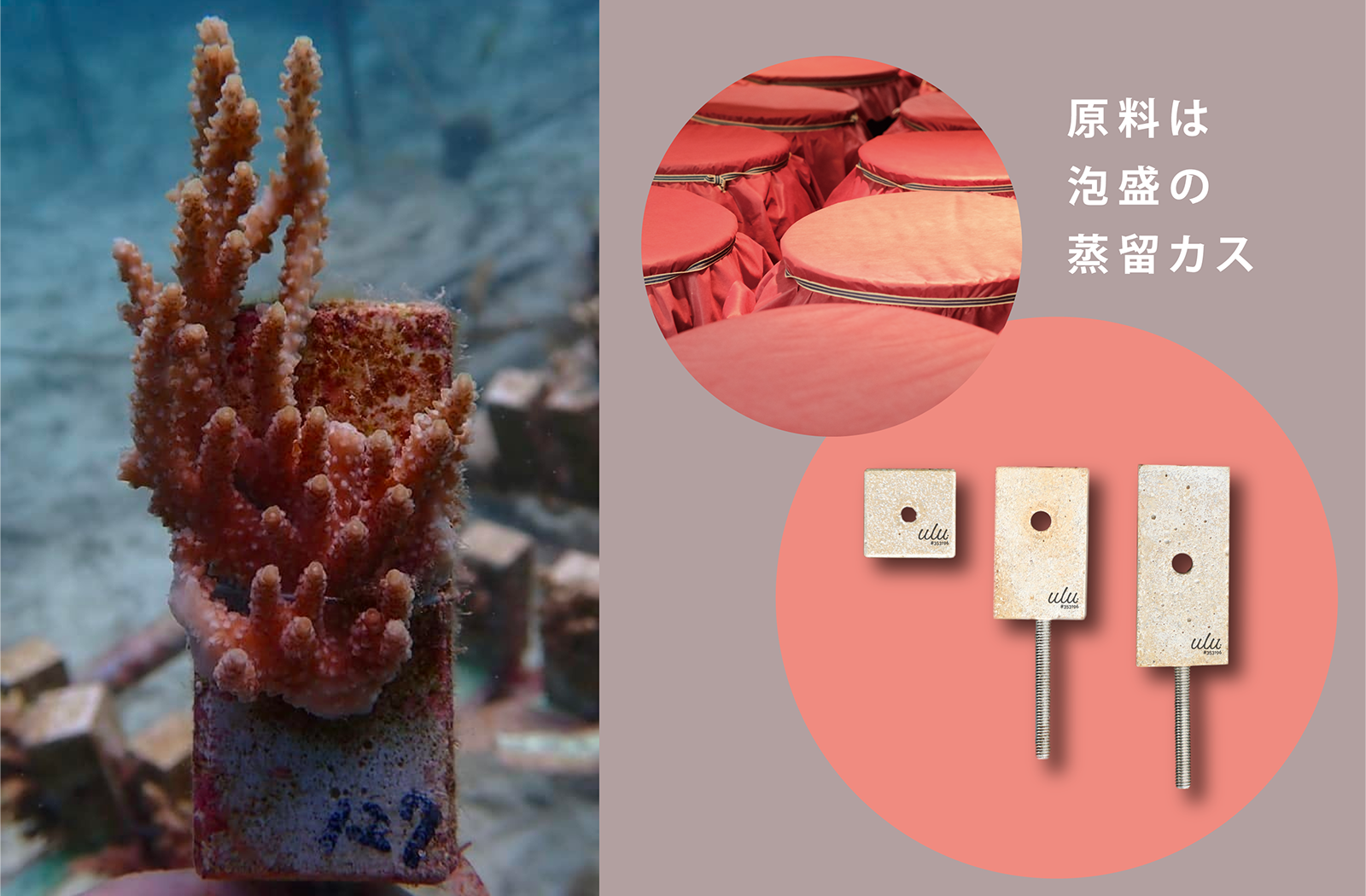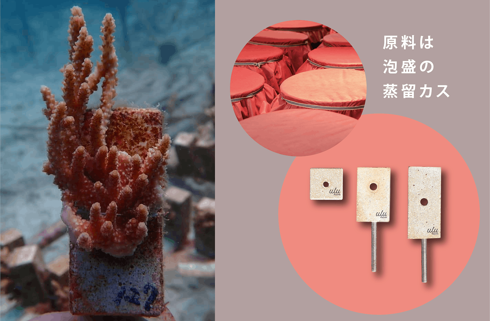 泡盛の蒸留粕はアミノ酸を豊富に含み、一部は健康食品などに活用されますが、その多くが廃棄されてきました。養殖スティックに活用することで、サンゴが育つための栄養が豊富であり、有機物でできているため環境への負担が小さいという特長を活かすことができます。