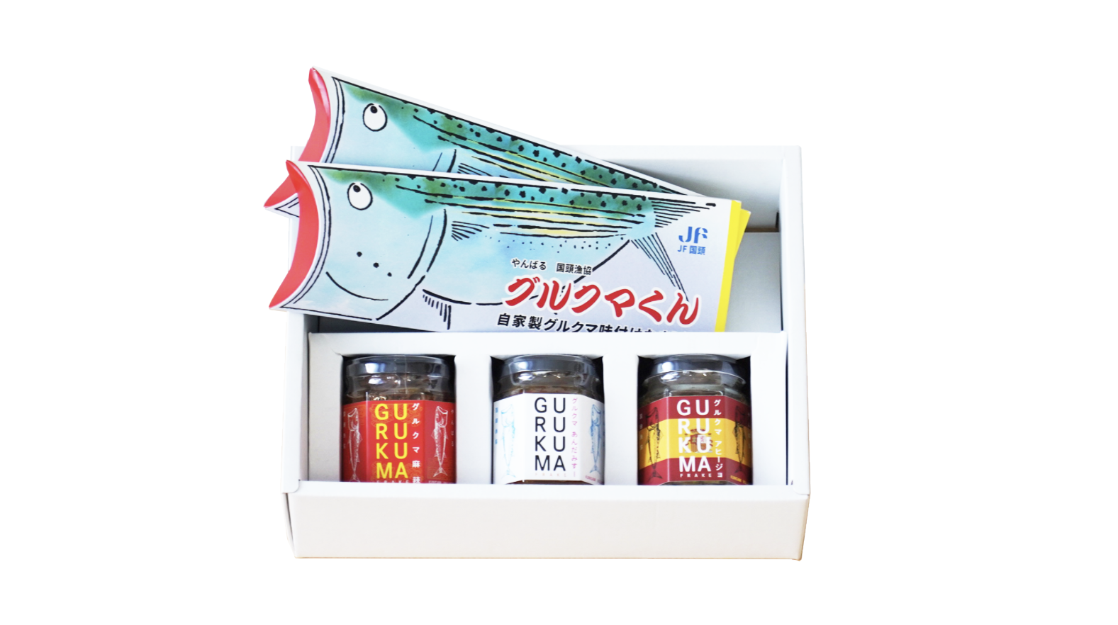 国頭漁業協同組合オリジナル製品「味付なまり節グルクマくん」と「グルクマフレーク」セット。フレークは沖縄の伝統料理の定番「あんだみすー」、オリーブとガーリックが香る「アヒージョ」、ピリ辛がクセになる「麻辣(マーラー)」の3種類です。