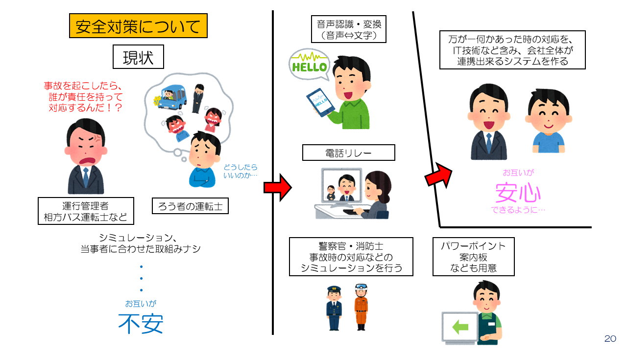 運転士とお客様の間にコミュニケーションが必要な面やアナウンスが必要な時に、音声認識器や字幕表示モニター等を設置し、音声から文字へ変換。文字を入力すると音声が出る仕様の他、ワンタッチでアナウンスが流れる(例:「右曲がります。」や「発車します。ご注意ください。」)仕様になったタブレット等をバス車内に設置する。
