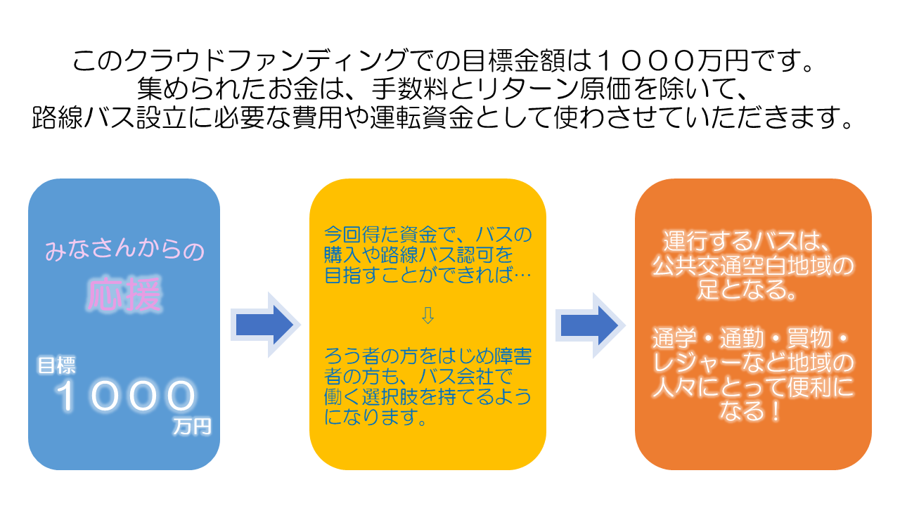 もし、目標金額達成に届かない場合は車両数や車両規模を小さくしたり、計画ルートを縮小したりなど小規模からスタートも考えており、バス運行出来る様に努めていきます。