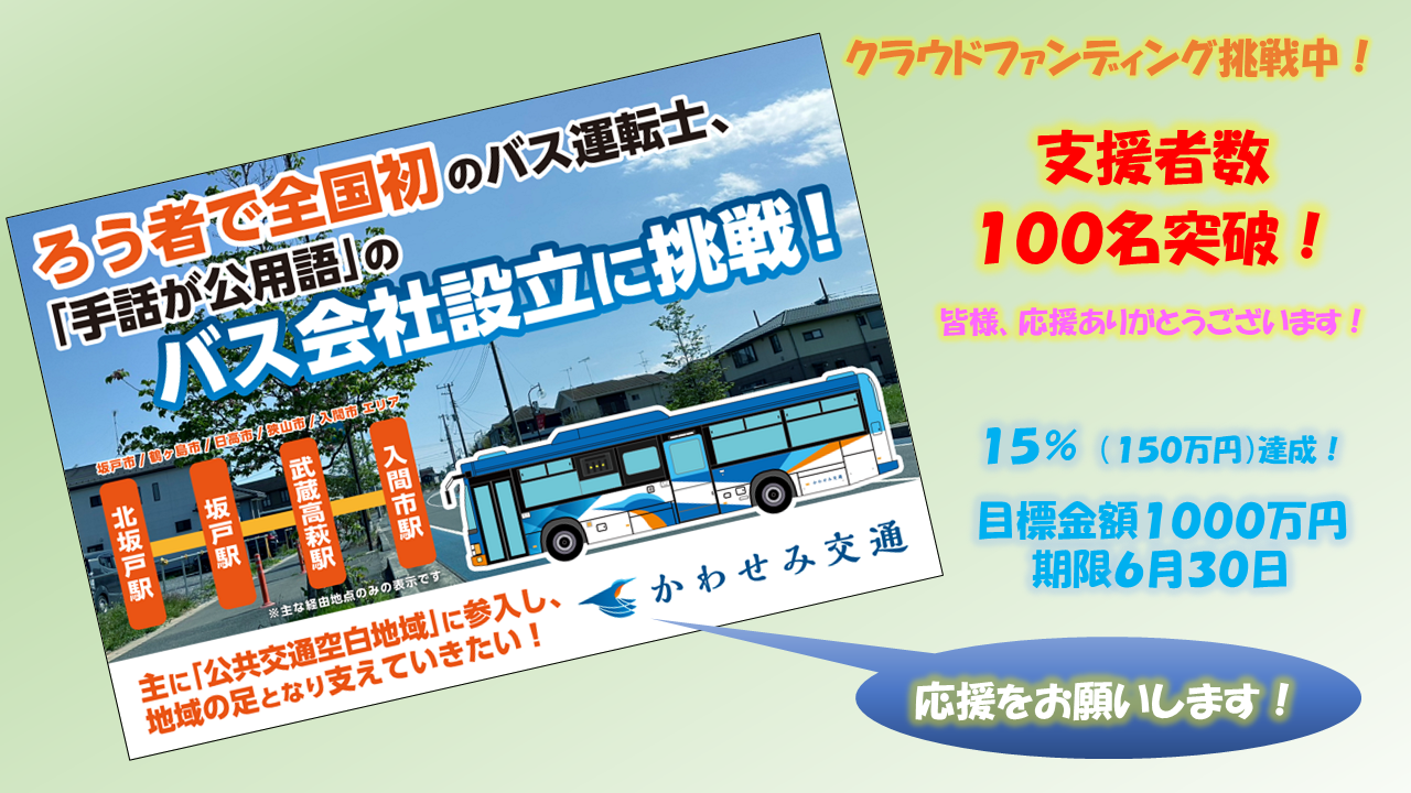ろう者の松山建也くんの想いが、まさに私たちの夢を現実のことにしようとしています!是非、「かわせみ」のデザインの路線バスが、街を颯爽と走る姿を見ましょう!乗りましょう!みなさまの応援を、どうぞよろしくお願いいたします!