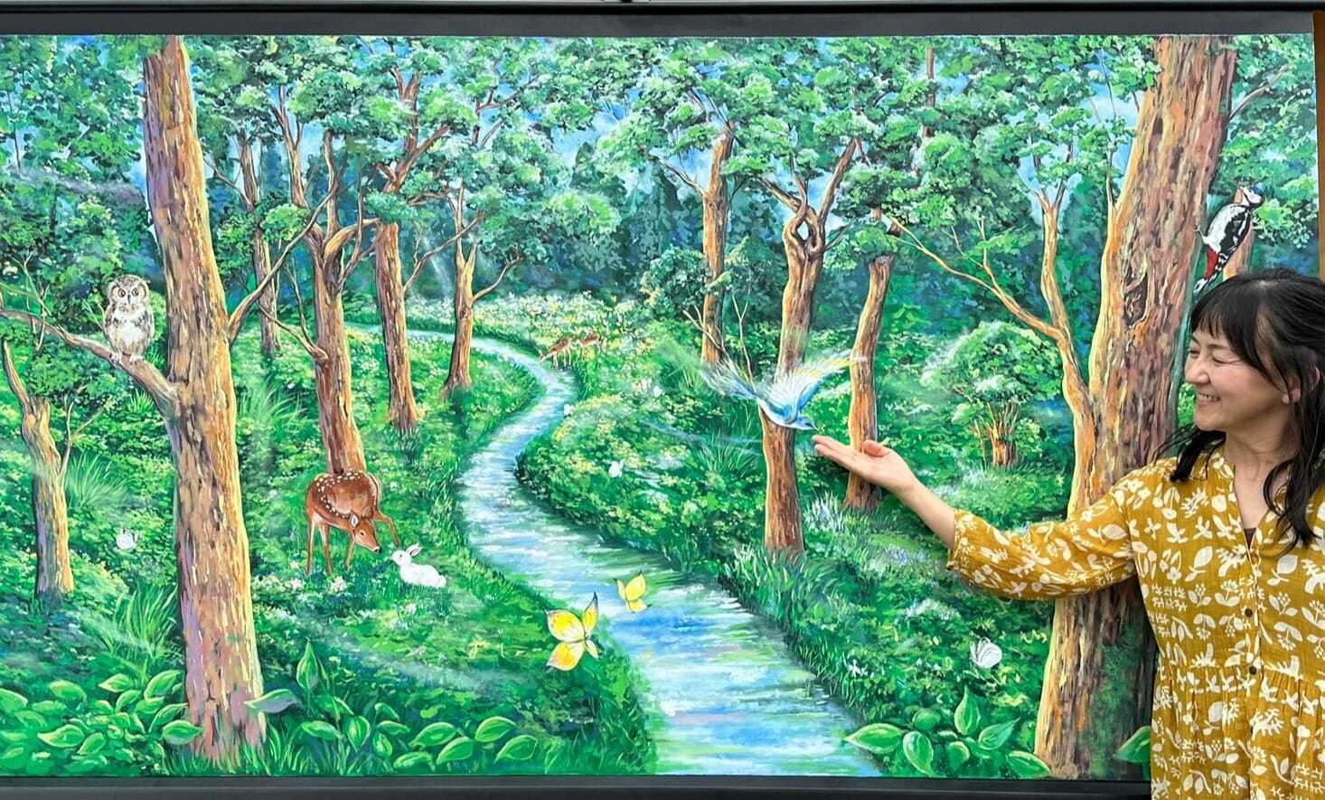 この移動式背景は、プロジェクターのスクリーンを利用してそこに直に絵を描いていただき作られた一点物の背景画になります。この背景を、カフェだけでなく、施設や個人様宅などへ運んで使って頂けるように考えています。