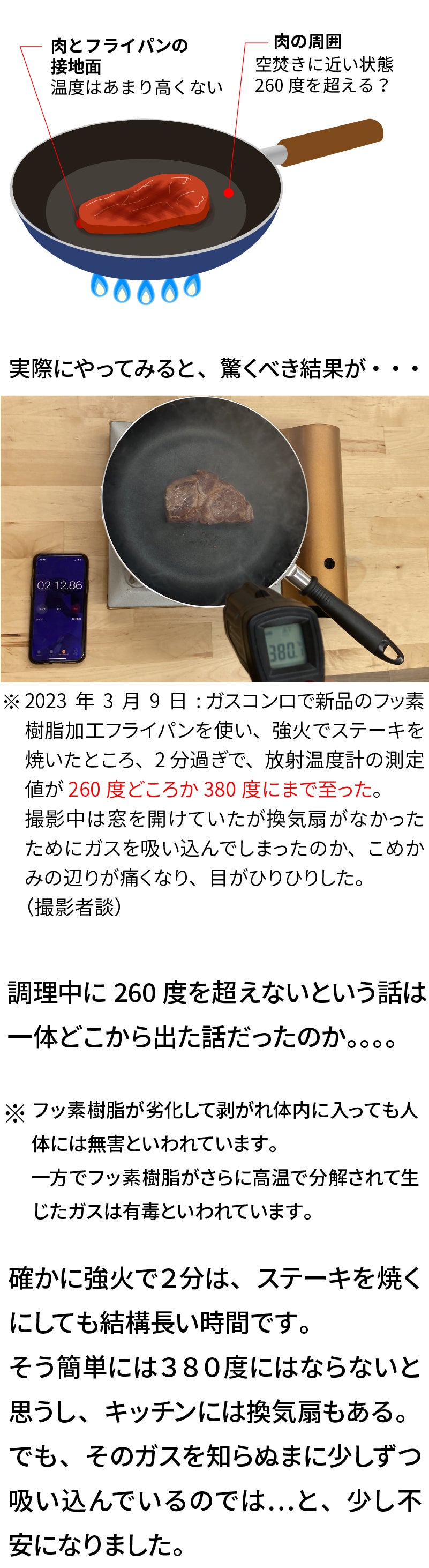 A. 食材の焦げ防止のために弱火~中火でのご使用をおすすめしますが、仮に空焚きして500度近くまで温度が上がっても有毒ガスは発生いたしません。