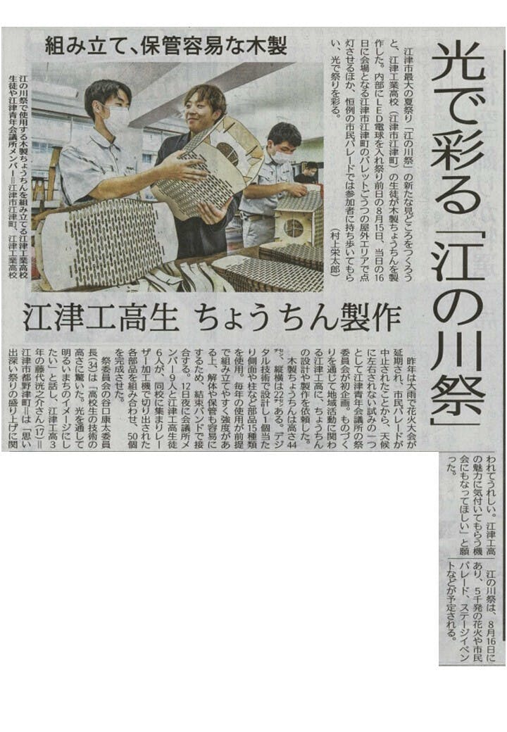 2023/07/19 18:00先日行った江津工業高校さんでの提灯作製について地元紙の山陰中央新報さんに掲載されました。多くの方にご注目いただきありがとうございます。今後も数件の取材などの予定がありますのでどこかで目にすることもあるかもしれません。(山陰中央新報 2023年7月19日) もっと見る