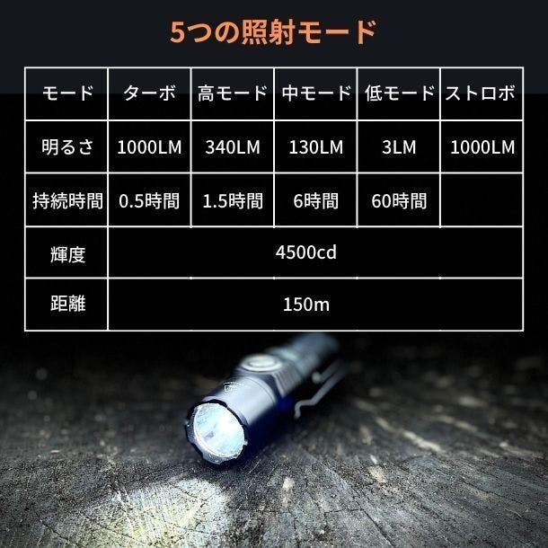 市販されている懐中電灯のルーメンは約50~100ルーメンが一般的で、300ルーメン以上になると高輝度でかなり明るいと言われています。しかし「ER16」はその3倍以上の高輝度1000ルーメン・ビーム距離150mの明るさで暗闇を一瞬で照らします。