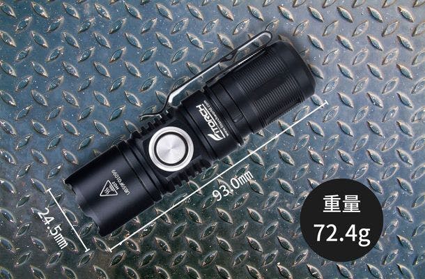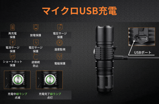 本体には充電式リチウムイオンバッテリー(16340・RCR123A・3.7V)内蔵。交換する場合は同型の充電式リチウムイオンバッテリーを推奨します。互換品としてリチウム電池(CR123A 3.0V)も使用できますが充電が出来ません。