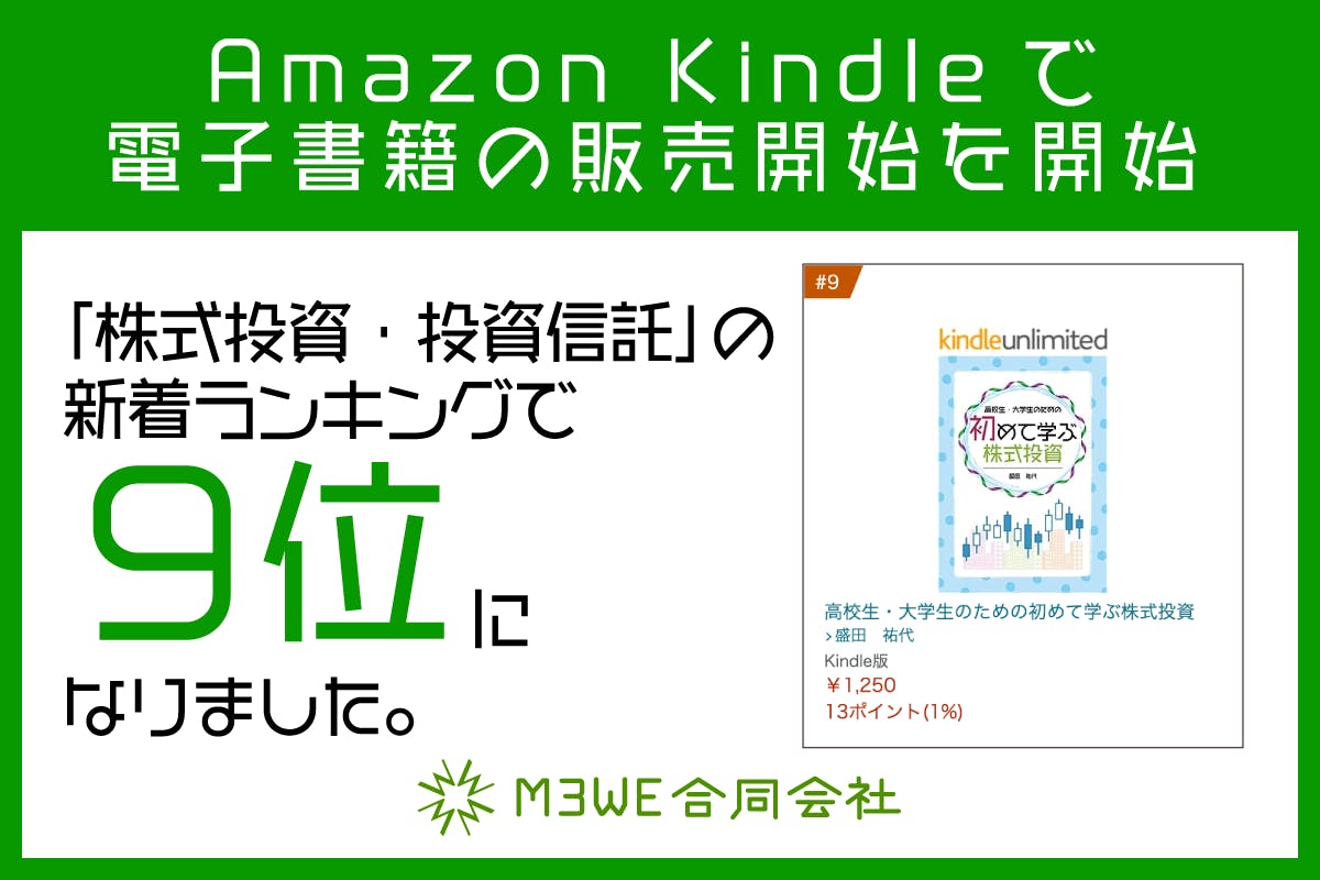 2023/08/26 16:22M3WEの盛田 祐代です。 今週よりAmazonのKindleにて電子書籍版「高校生・大学生のための初めて学ぶ株式投資」の販売が開始となりましたのでご報告します。https://amzn.asia/d/gJO2o7I なんと「株式投資・投資信託」の新着ランキングで9位になりました。たくさんの方にご興味を持っていただいたことを大変嬉しく思います。ありがとうございます。 Kindleunlimitedにも対応しています。ご興味のある方は、気軽にアクセスしてみてください。<ご注意ください>*本誌は高校の資産形成の授業に対応した内容ではありません。*本誌は、投資の基礎知識や様々な売買手法及び考え方についてご紹介していますが、投資成績を保証するものではありません。最終的な投資の判断はご自身で行っていただきますようお願いします。*クラウドファンディング版には投資ノートがついていましたが、電子コンテンツにはついていません。また、クラウドファンディング版と一部内容が異なります。(基本的な内容は同じですので、クラウドファンディング版をお持ちの方がこちらもご利用いただくと、同じものが2冊というイメージになります) もっと見る