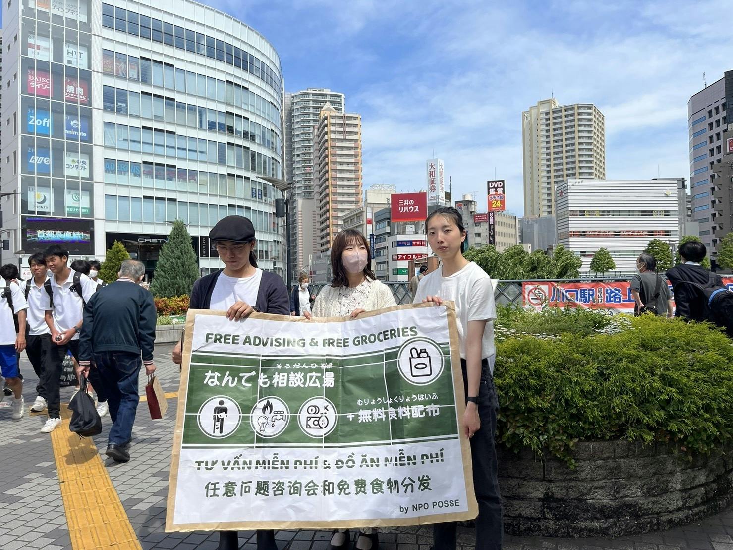 2023/05/07 14:555月6日(土)に、川口駅前の「川口市民パートナーステーション」で相談会を開催しました。当日は、ボランティアが街に出て300枚以上のチラシを配りながら、道ゆく人に「困っていることはないか」と声をかけ、アウトリーチ活動を行いました。また、川口駅・西川口駅周辺の食材店や飲食店を周り、労働問題や生活上の問題を抱えている方に対して相談会の情報を広く周知するため、チラシの設置をお願いしました。相談会場では、さまざまな深刻な相談が寄せられました。その中の一部を紹介します。①休みを申し出たら解雇され、ホームレス状態に。花の栽培の仕事をしていた女性。体調不良で月2〜3日休むということが続いていたところ、突然解雇になり、住んでいた寮を追い出された。ホームレス状態になり、現在は友人の家に居候している。②保険証がなく、5歳の子供を病院に連れていけないクルド人の3人家族。夫は失業中。トルコで迫害に遭い、日本に逃げてきたが、妻と幼い息子は「特定活動3ヶ月」のビザしかもらえておらず、保険加入の対象者にならない。診療が全て自費負担になってしまうため、よほどのことがない限り、病院には行かないようにしている。先日息子が額を切る怪我をした時は病院に連れて行ったが、一回の診療で3万円が必要となり、友人から借金をして工面した。妻は最近妊娠が発覚したが、手持ちのお金がなく、病院に行けずにいる。会場では、このような「ホームレス状態にある」「病院に行けない」「今日の食事の確保すら難しい」など、基本的な衣食住の権利すら奪われている人たちからの相談が相次ぎました。私たちは、食料の提供を通じて相談者の方々のその日の生活を支えるとともに、労働組合を通じて会社と交渉し解雇を撤回させるという選択肢の紹介や、行政の提供している支援制度の紹介を行いました。5月7日も、相談の受付と、アウトリーチを引き続き行なっていきます。 もっと見る