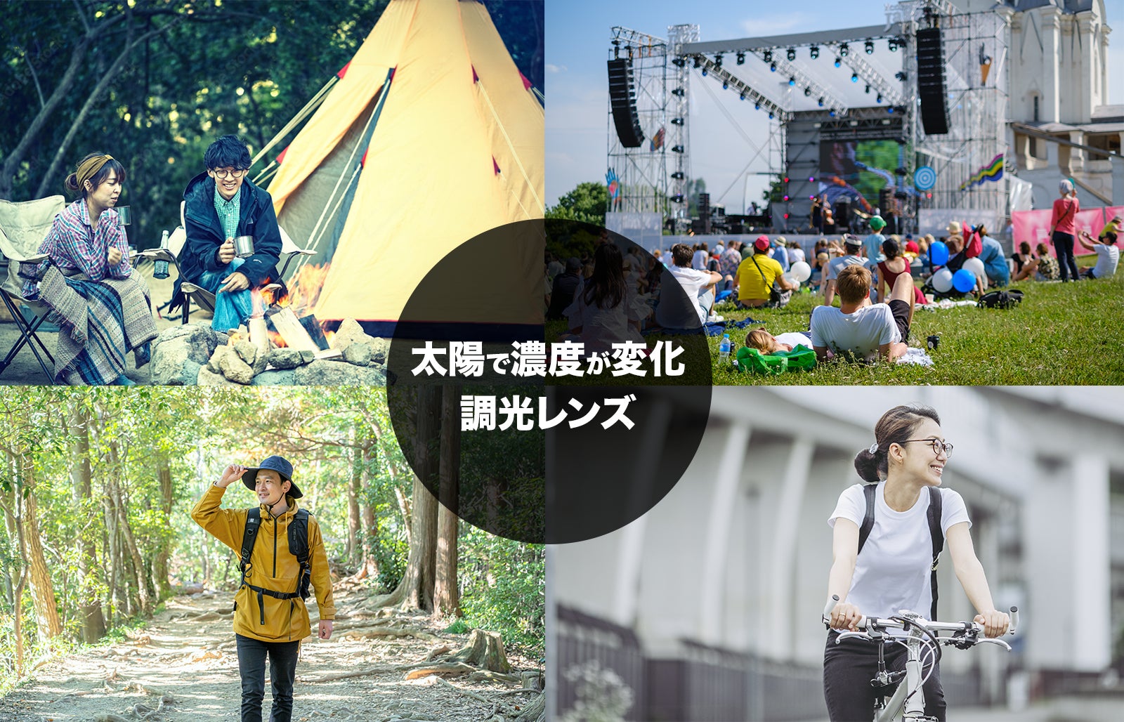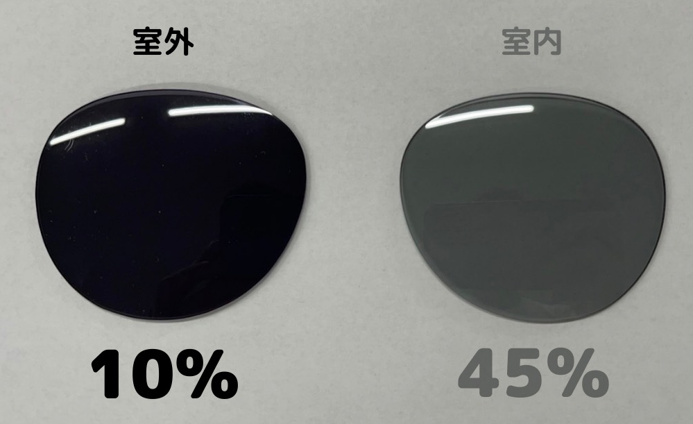 調光レンズとは、レンズの色調を自動的に調整することができる機能です。屋内や暗い場所ではクリアなレンズ(室内45%、室外10%)であり、屋外や日差しの強い場所では暗くなり、眩しさを抑えることができます。