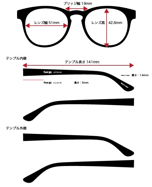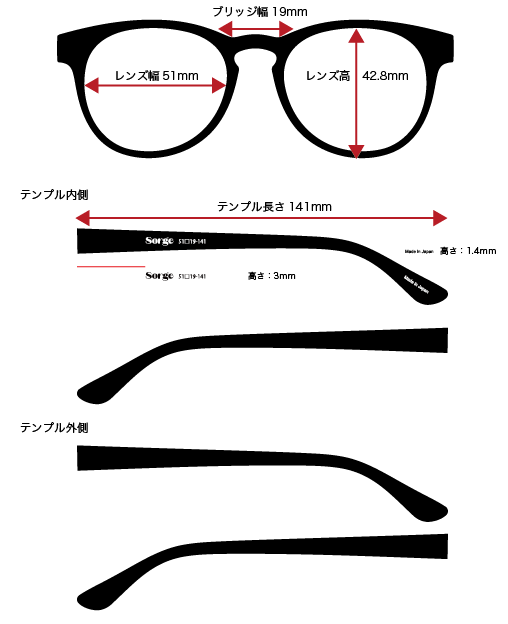 ・レンズ縦幅:(最長)42.8mm・テンプル幅:141mm