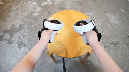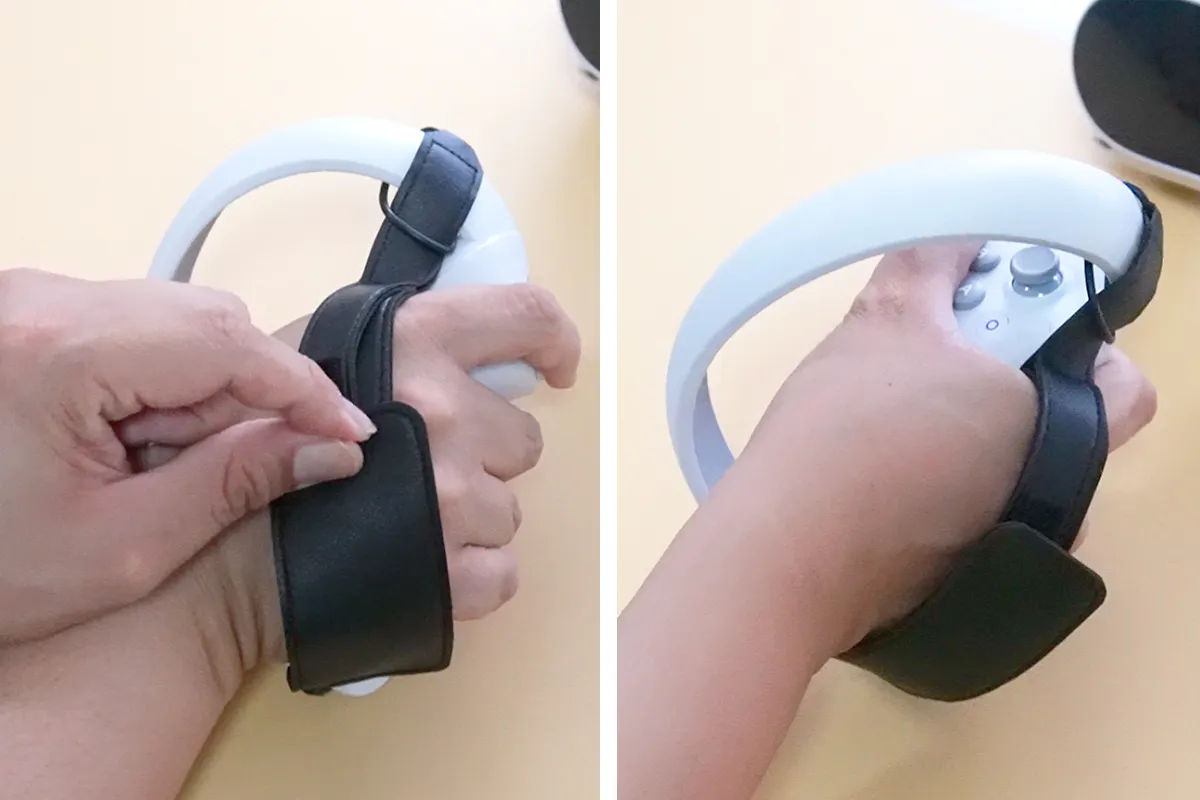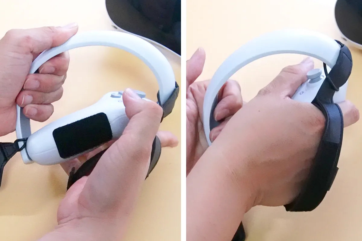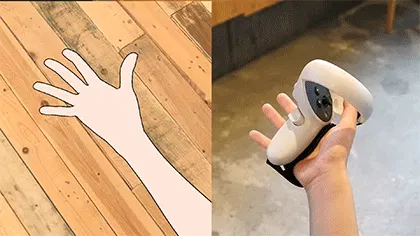 VRゲーム中、現実世界のモノを掴むには、コントローラーを一度机上に置いたり、手首のストラップを使ってぶら下げたりしないとモノがつかめません。視界が悪くなるVRゴーグル中は、こういう動作がとてもめんどくさい・・