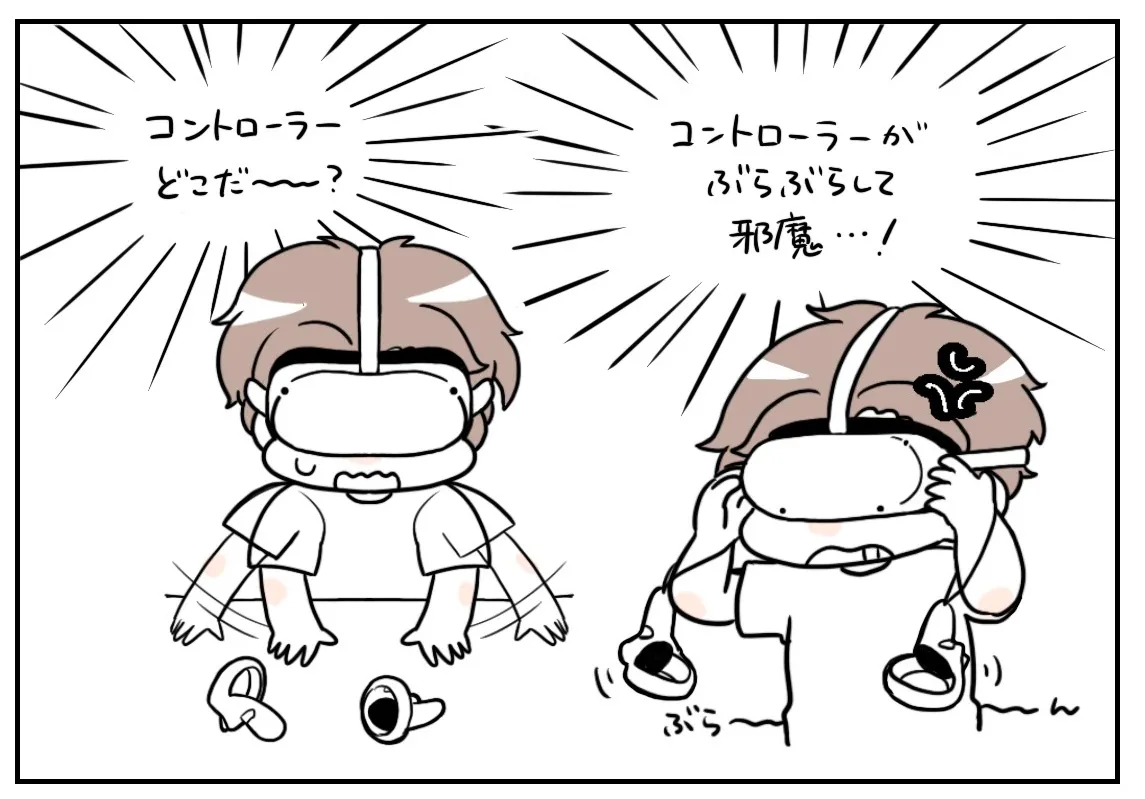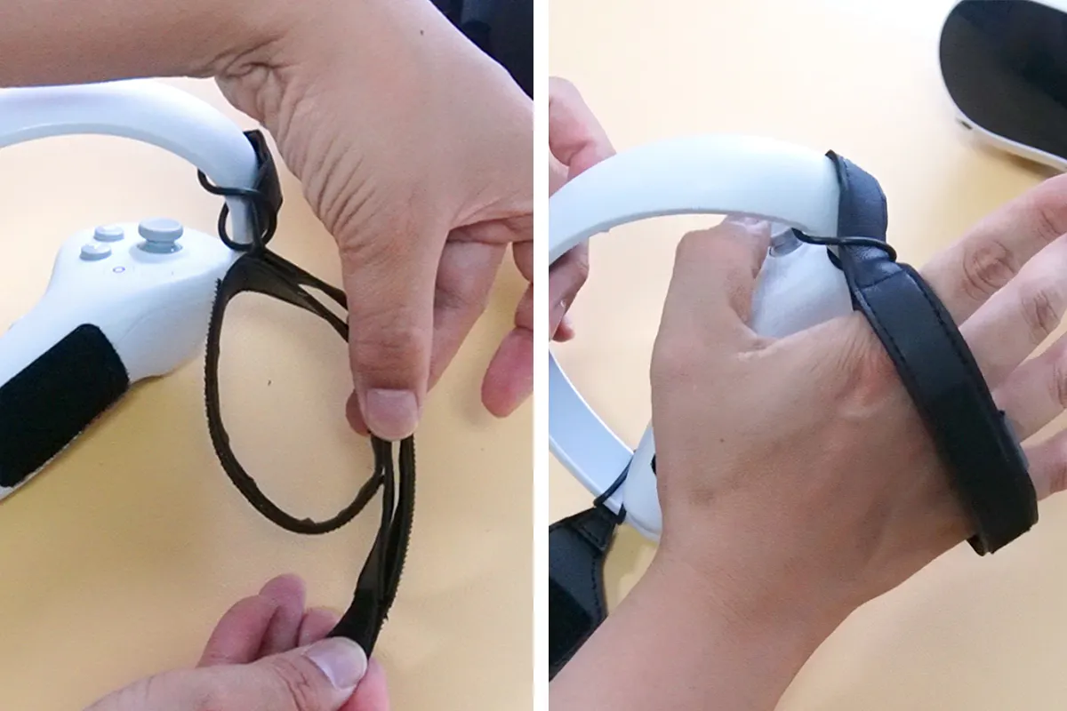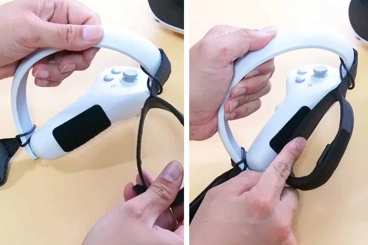 VRゴーグルを先に頭部に取り付けると、視界が悪い状態でコントローラーを探す手間が生まれます。