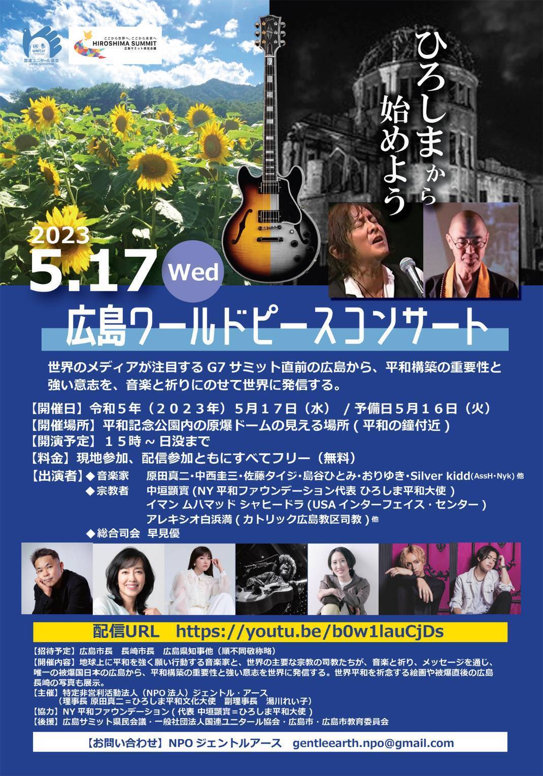そこで広島でG7サミットが行われ、世界のメディアが広島に注目するこのタイミングで、有志のミュージシャンやアーティスト、宗教の垣根を越え思いを共有出来る宗教者の皆様とピースコンサートを行い、世界に向けて平和構築の大切さとそれを実現する強い意志を、最大限に発信していきたいのです!!