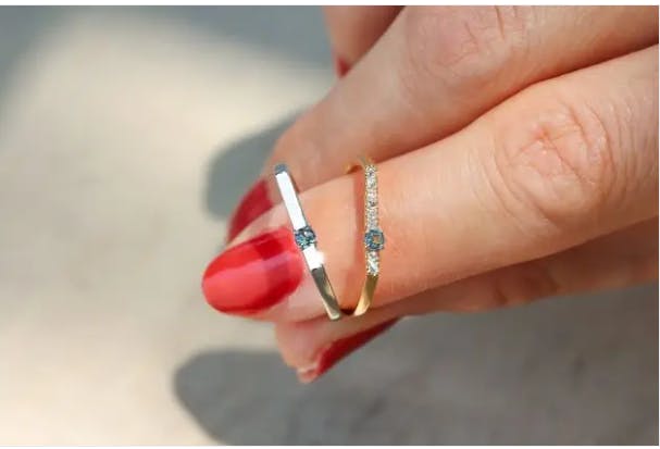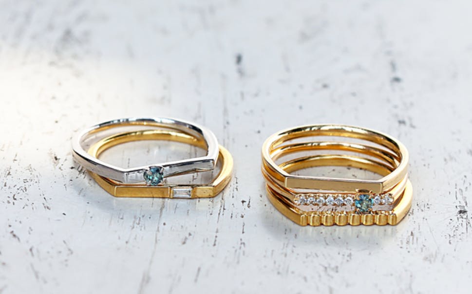 *画像 左から「flat.D 一粒アレキサンドライト pt900」、右「flat.D よくばりアレキサンドライト K18
