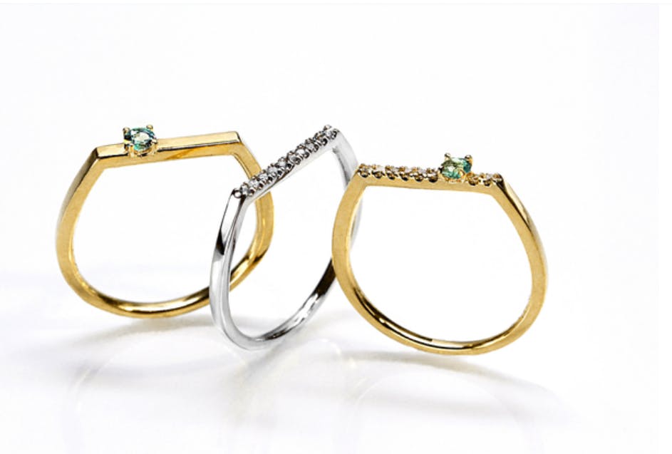 *画像 左奥から「flat.D よくばりアレキサンドライト K18」、「flat.D 一粒アレキサンドライト pt900」