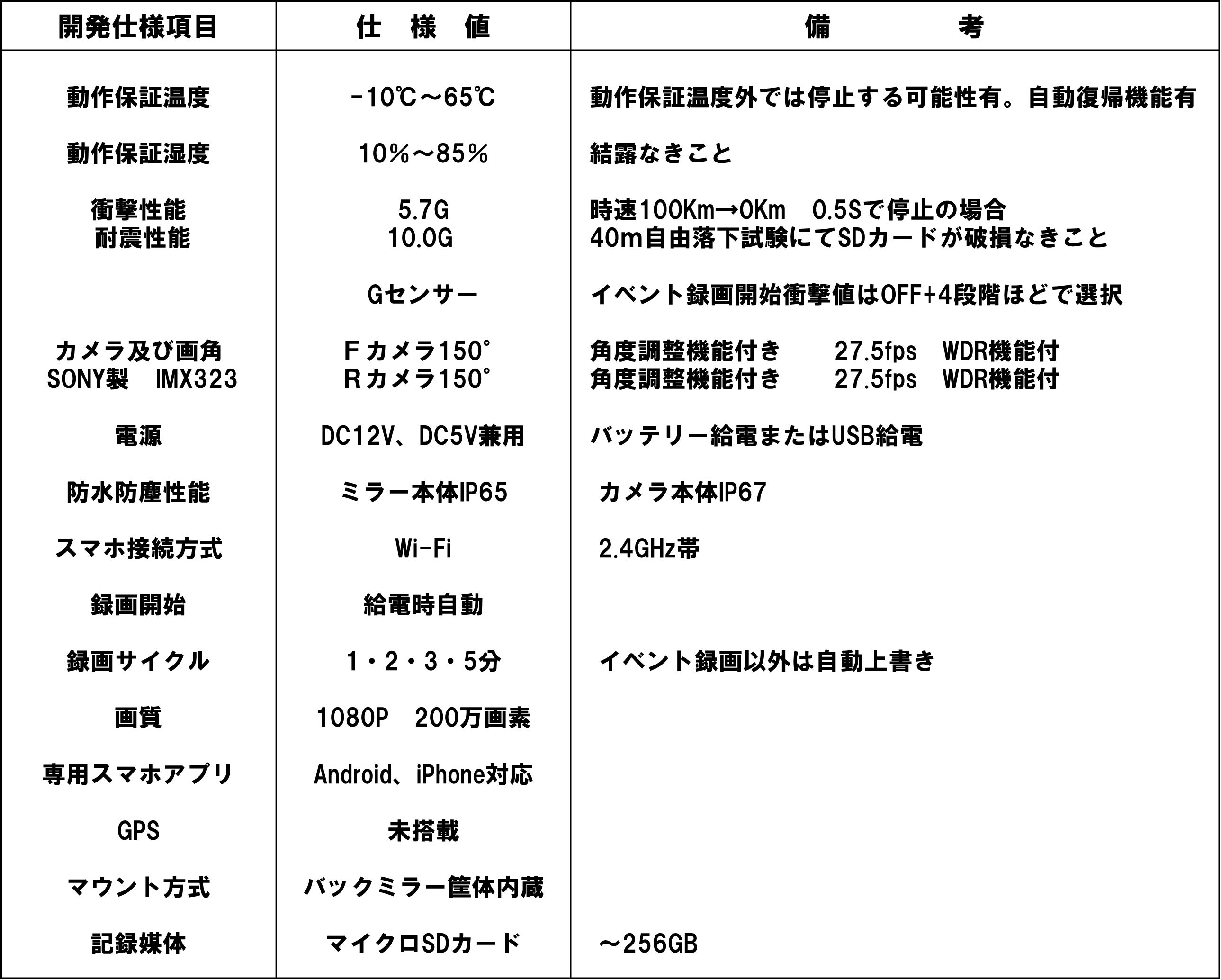 ・特許取得により世界初となる当商品は、煩雑な配線を無くし、電源線1本(USB 5V or 車体12V)で稼働するバックミラー型前後ドライブレコーダーであり、もちろん防塵・防水・耐振動仕様で車検対応品です。証拠動画はSDカードもしくはWi-Fi経由で取り出しができます。一般の前後ドラレコはどんなに進化しても配線は3本必要ですが、当商品はそれを解決して1本にしたうえ、前後の取得画角問題を解決しました。もうカメラの設置位置に悩まなくて済みます。