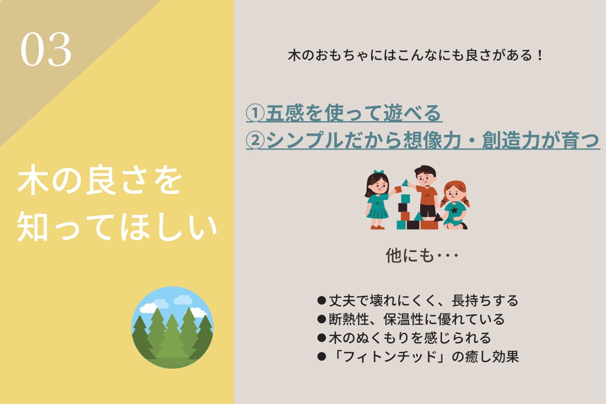 自分が感じた木のおもちゃの良さを今の子どもたちにも広めたい!