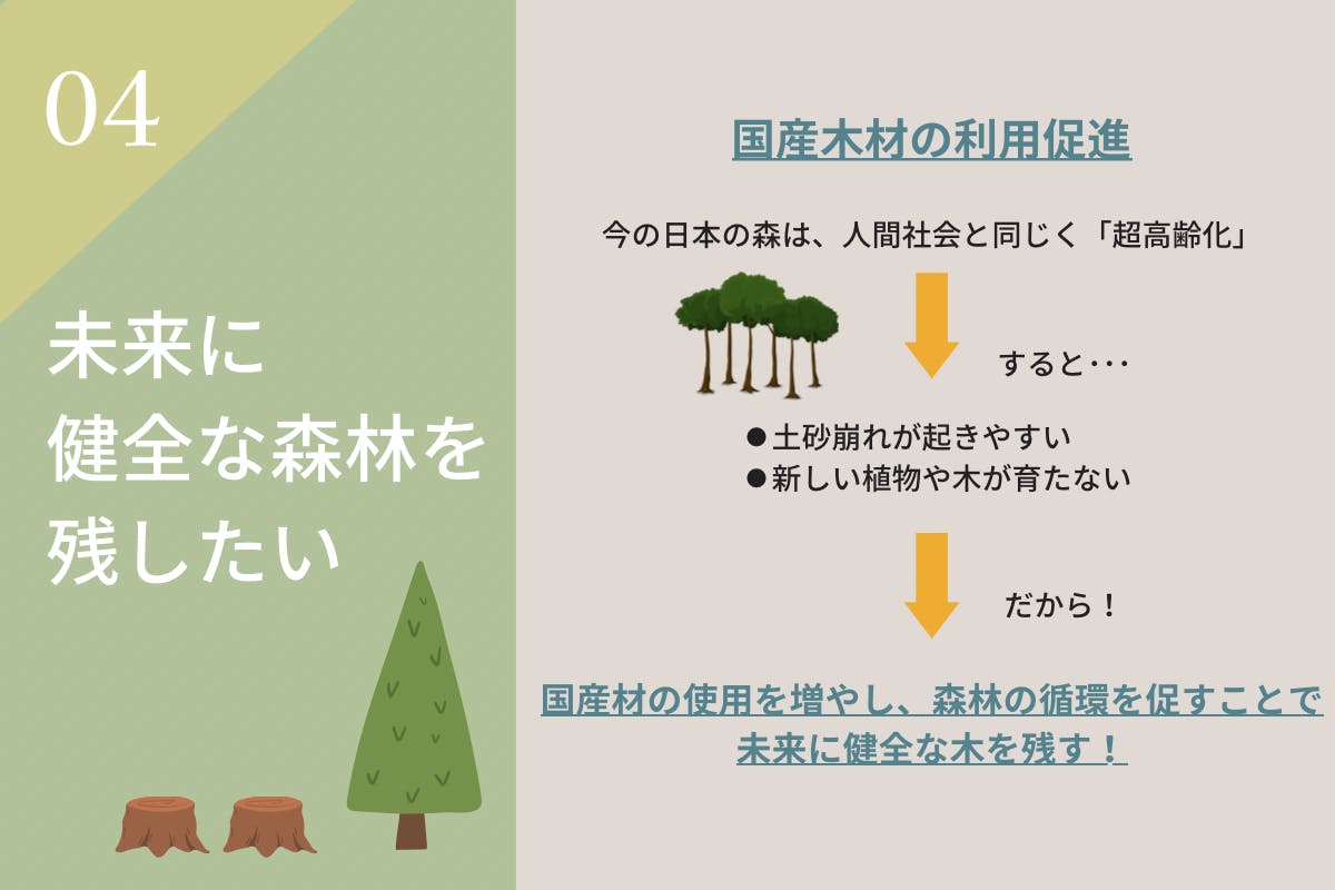 森林を健全な状態に戻し、未来に健全な森林を残すためにいま必要なことは、「木を使う」ことです。