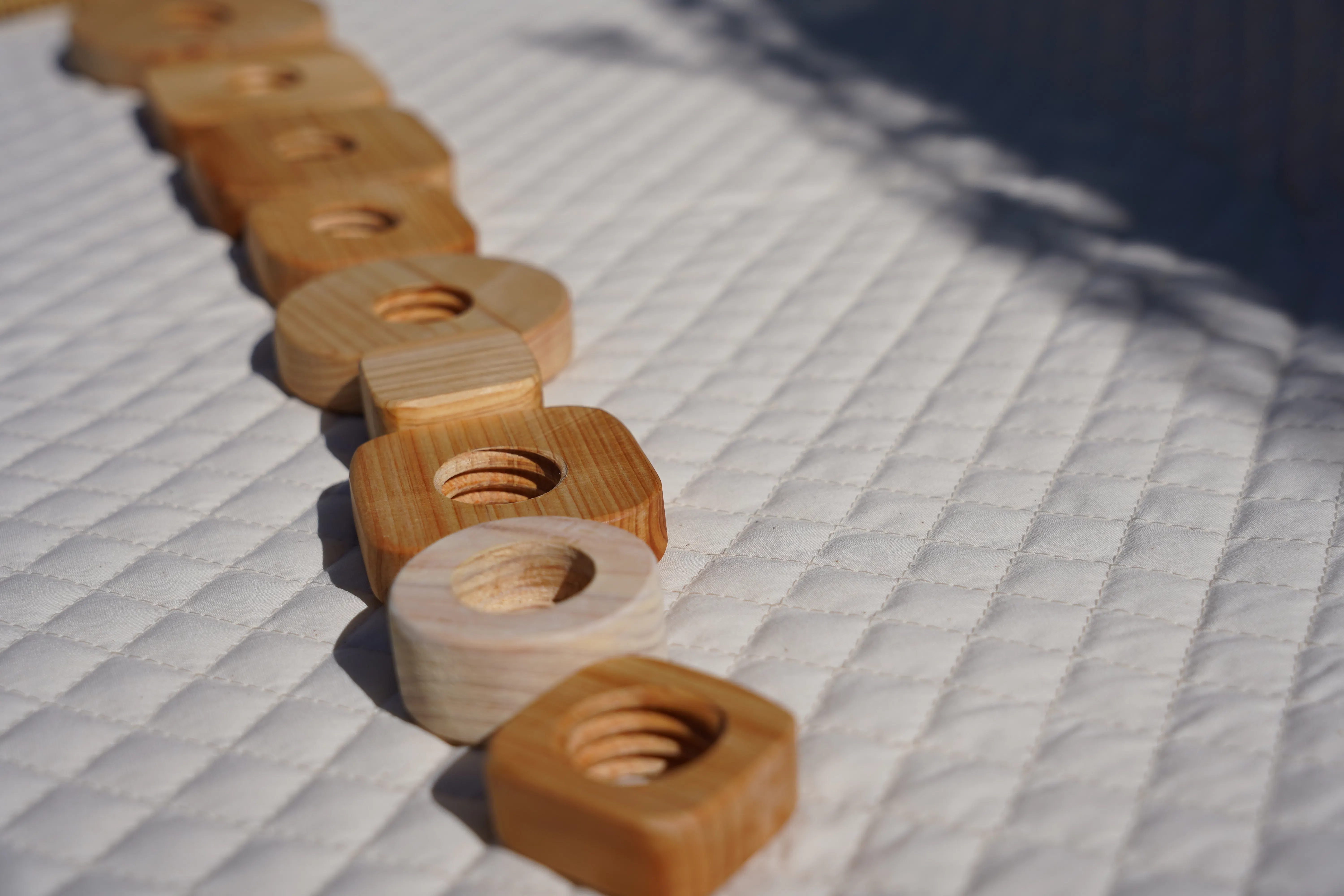 色や木目は使用する木の部位、加工方法によって様々なパターンがあります。また香りや重さは木の種類によって大きな違いがあります。そしてぶつけた時の音は、ストレスを感じにくい柔らかい音です。そういった子どもの五感を刺激する要素を、木のおもちゃは多く持っています。なので、木は五感を育てるために最適な素材だと、MOKU Fiは考えています!