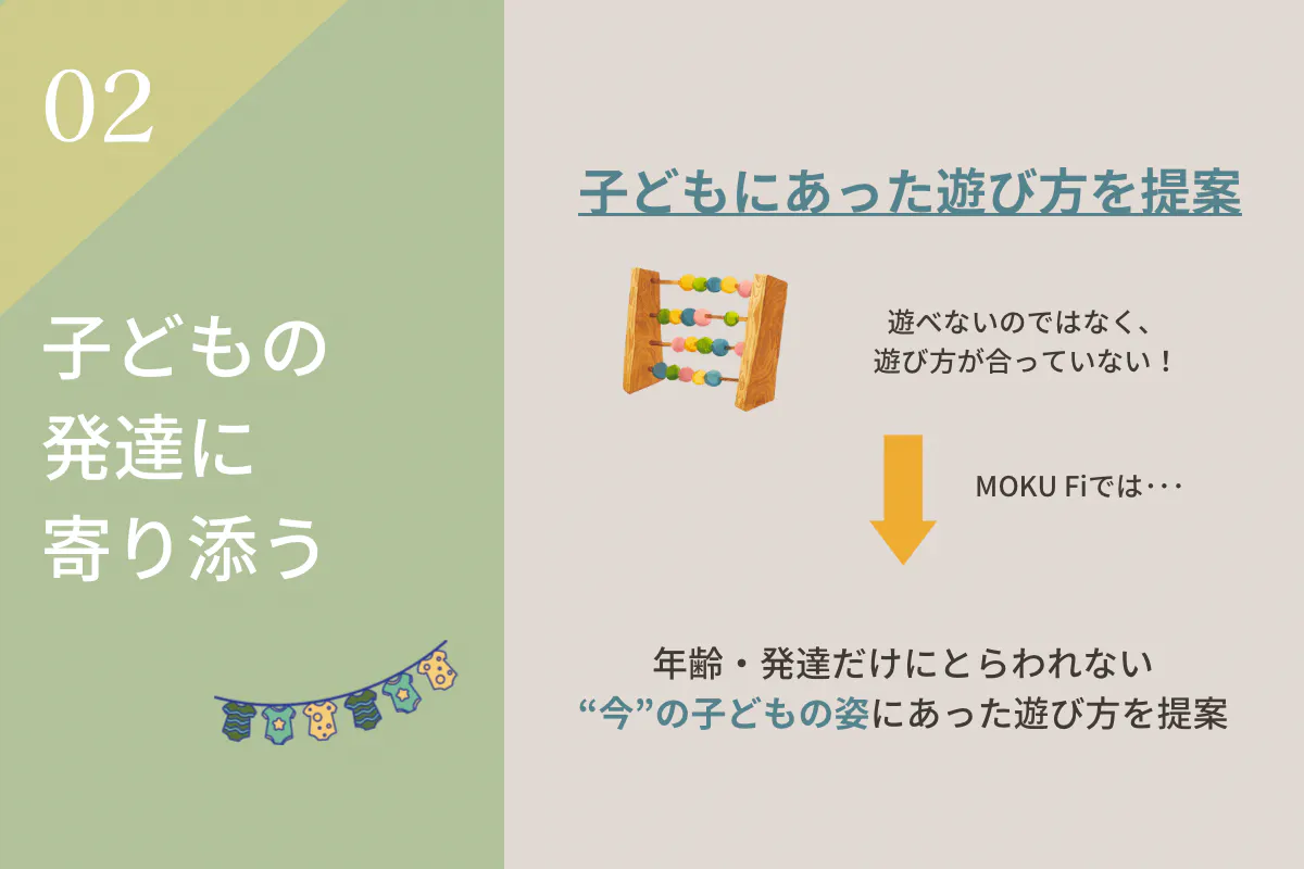 MOKU Fiでは1つのおもちゃで何通りもの遊び方ができるということを大人に伝え、子どもたちが発達に合った遊びができるようお手伝いをします!