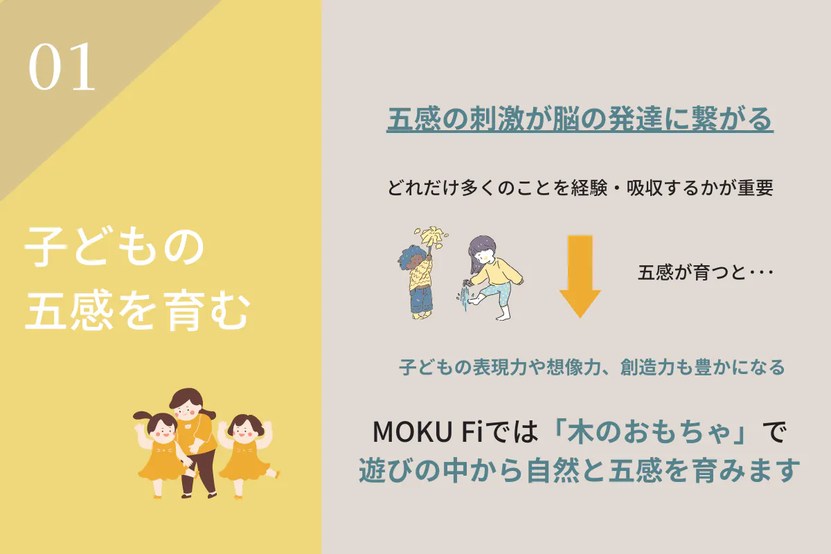 MOKU Fiは木のおもちゃで、あそびの中で自然に五感を刺激し、育んでいきたいと考えています。
