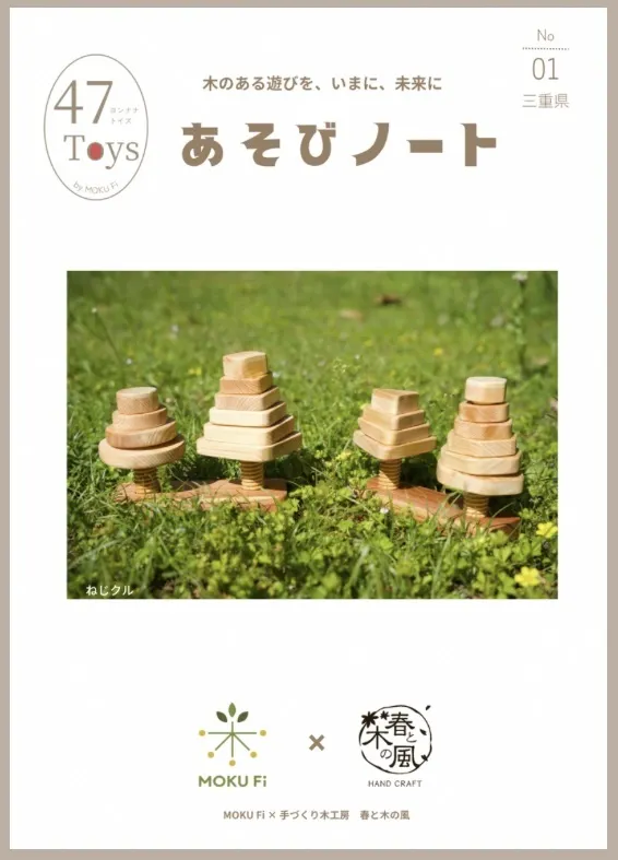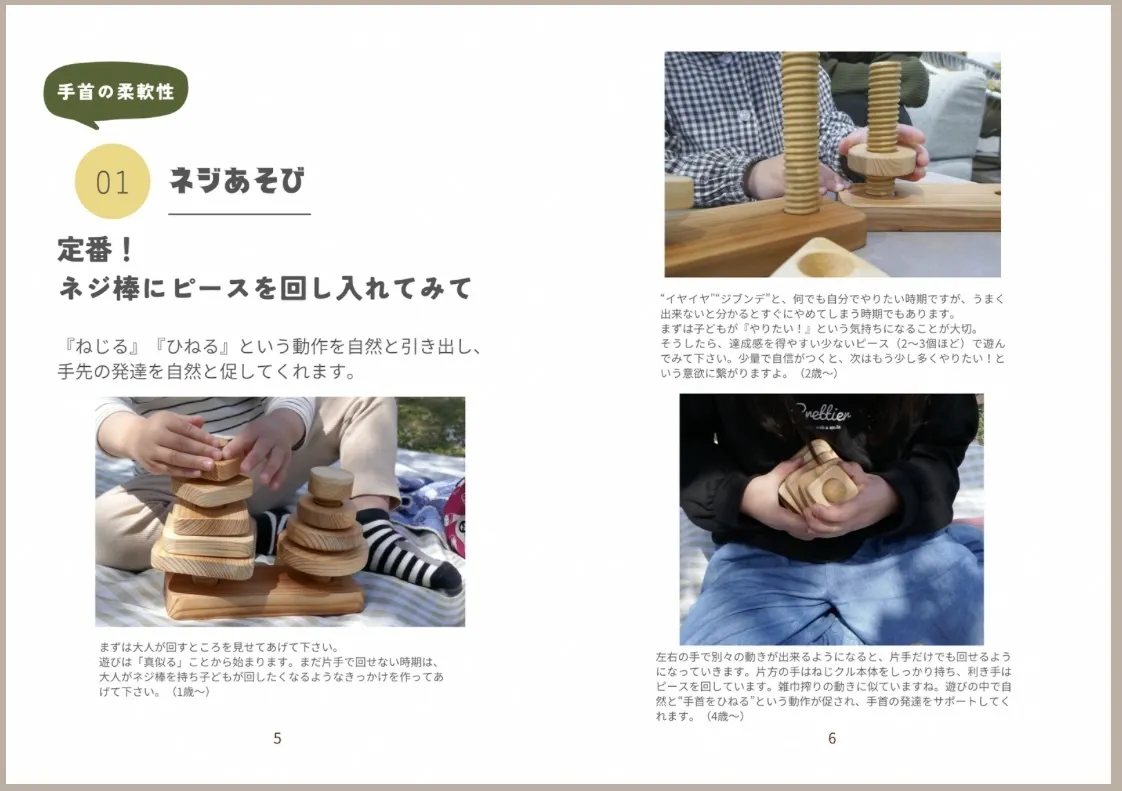 一つのおもちゃでいくつもの遊び方を提案する「あそびノート」という冊子を作り、すべてのおもちゃに付属させます。