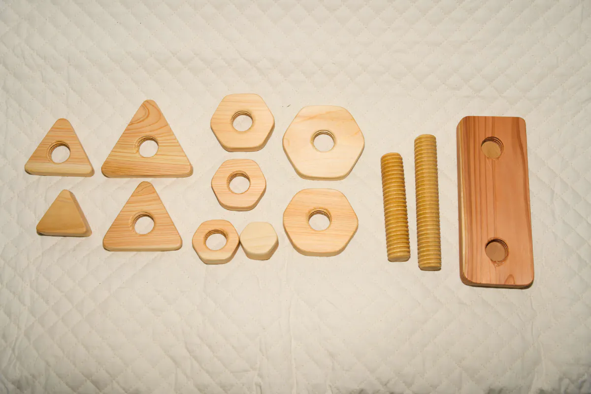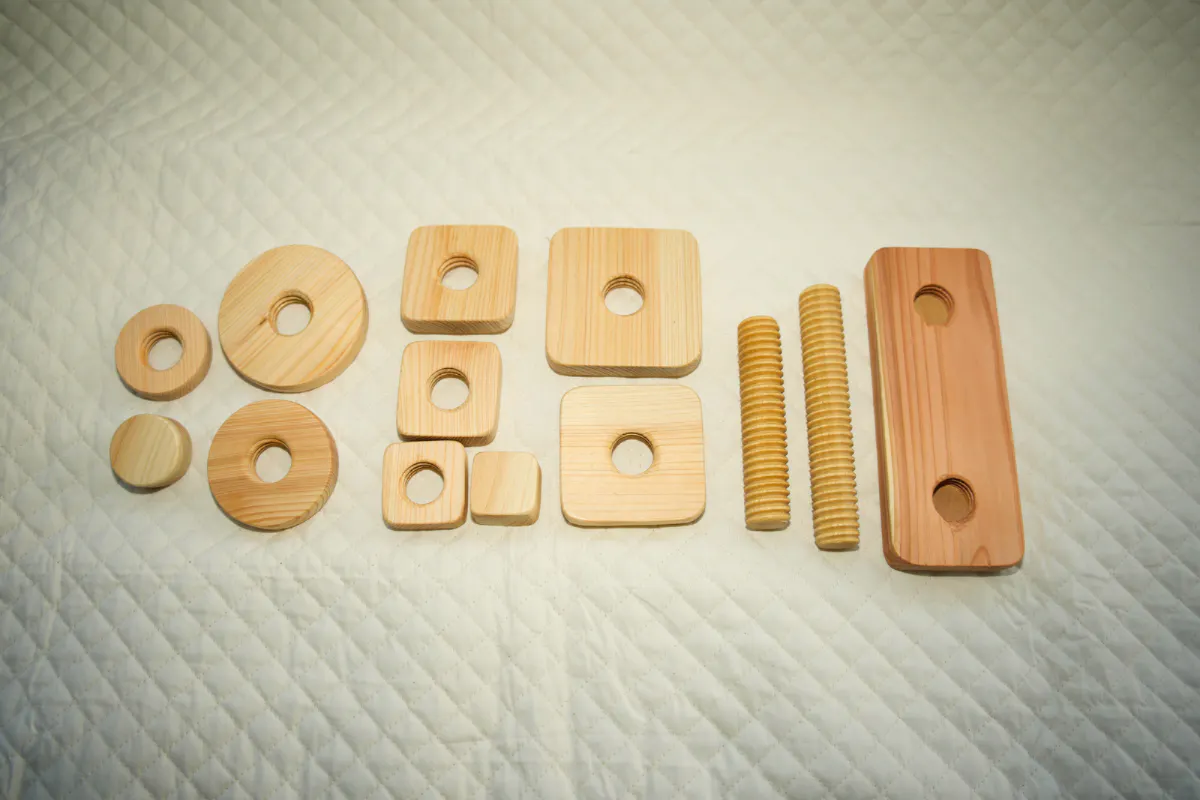 台座はスギ材、各ピースはヒノキ材となっております。ネジ棒は加工の難しさから他の地域より木材を取り寄せていますが、国産材を使用しております。