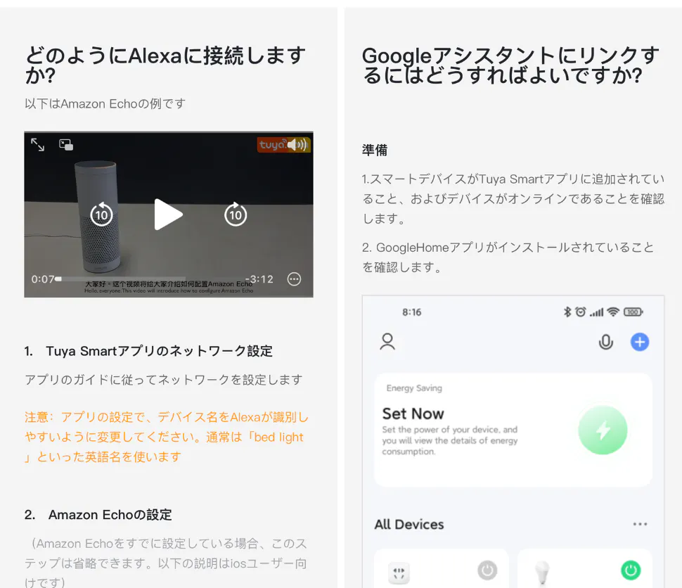 🔻それぞれの接続方法は、「Tuya Smart」アプリ内で詳細を確認することができます。