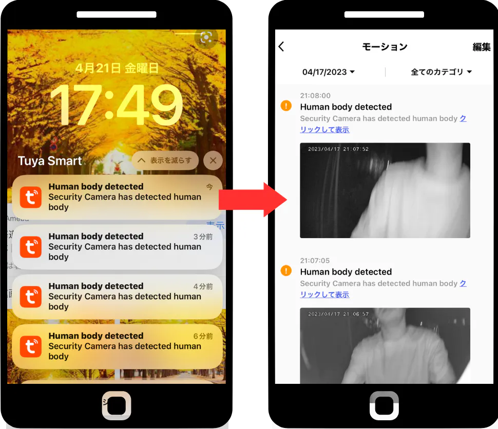 人間を検知したらアプリを通して、瞬時にスマートフォンに通知されます。