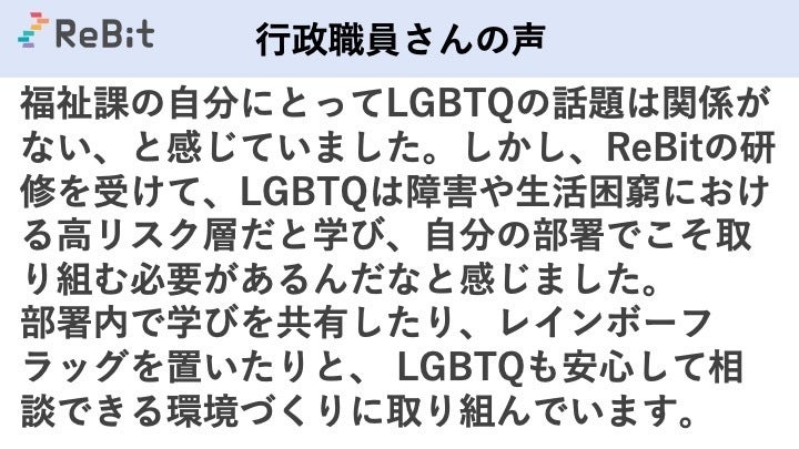 福祉は生きるなかで何度も活用しうるセーフティーネットだからこそ、LGBTQも安心して福祉や支援を受けられる地域は、LGBTQも安心して生きられる地域です。LGBTQを含めた全ての人たちが自分らしく暮らせる、そんな社会を一緒に広げていただけましたら幸いです。ぜひ、応援・お力添えをお願いいたします。